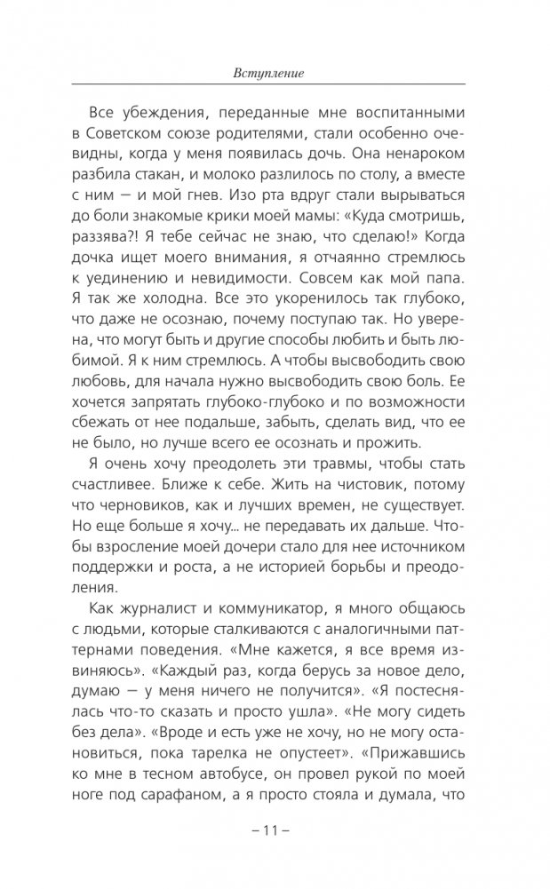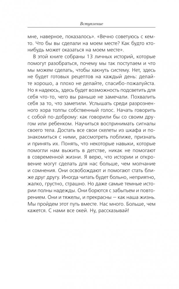 В книге собраны 13 историй, которые помогут разобраться, почему мы так поступаем и что мы можем сделать, чтобы хакнуть вшитую в нас систему воспитания. Нет, здесь не будет готовых рецептов на каждый день — делайте хорошее, а плохое не делайте. Но вы узнаете, как среди разрозненного хора услышать собственный голос. Вы сможете достать все свои скелеты из шкафа и познакомиться с ними, рассмотреть поближе, признать и принять их. Поймете, что вы не одни такие. Получите поддержку и принятие.