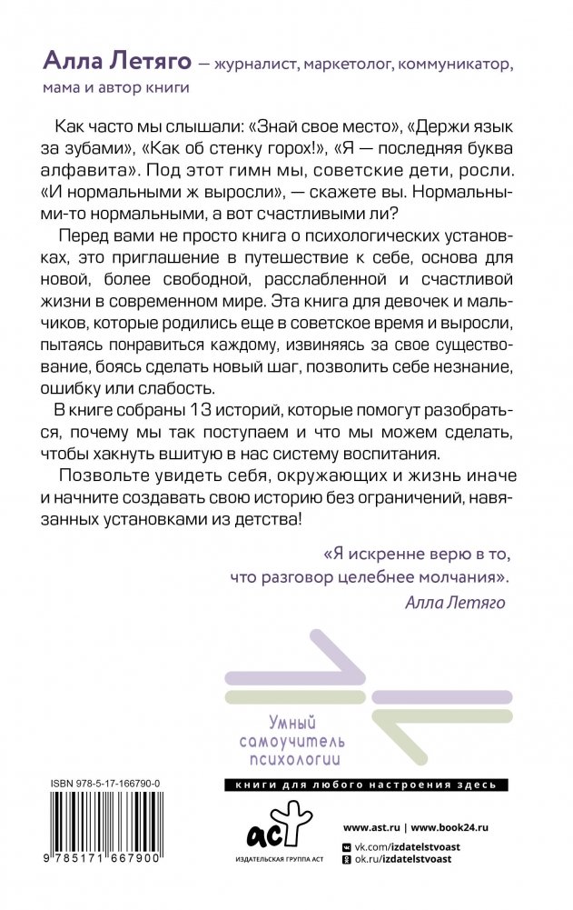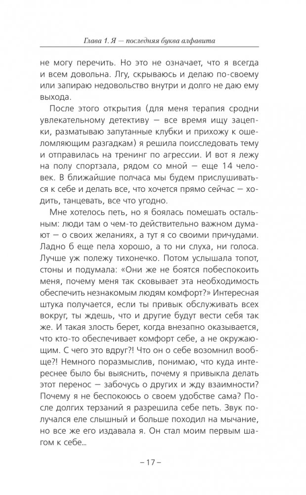 Перед вами не просто книга о психологических установках, это приглашение в путешествие к себе, основа для новой, более свободной, расслабленной и счастливой жизни в современном мире. Эта книга для девочек и мальчиков, которые родились еще в советское время и выросли, пытаясь понравиться каждому, извиняясь за свое существование, боясь сделать новый шаг, позволить себе незнание, ошибку или слабость.