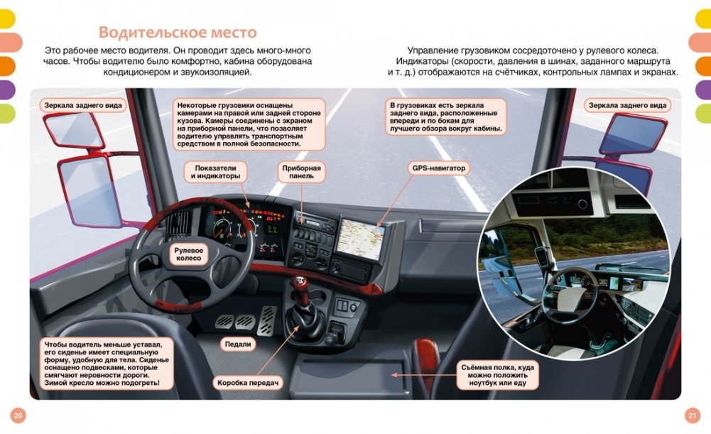 Эта книга расскажет о больших машинах. Юные читатели узнают об истории создания грузовых автомобилей, устройстве кабины полуприцепа, грузовиках будущего, работе пожарных и строительных машин. В книге также представлены уникальные виды техники: гоночные грузовики, автоцистерны, фургоны-коневозы и даже самый большой самосвал в мире!