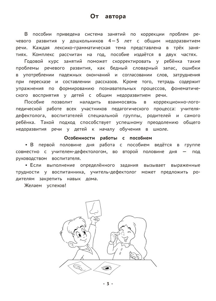 Логопедическая тетрадь предназначена для работы с детьми 4—5 лет. Основная цель пособия — реализация комплексного подхода в коррекции общего недоразвития речи, который осуществляется в тесной взаимосвязи педагогов и родителей воспитанников. Издание способствует выполнению задач программы «Воспитание и обучение детей с тяжёлыми нарушениями речи».