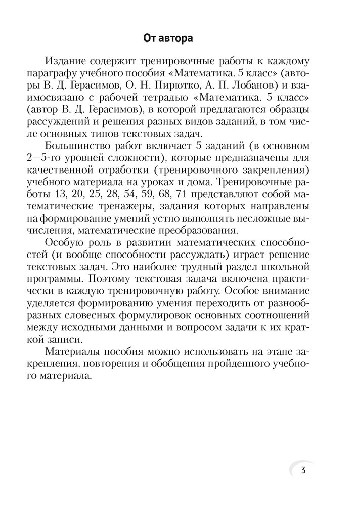 Издание содержит тренировочные работы к каждому параграфу учебного пособия «Математика. 5 класс», которые включают, как правило, 5 заданий разного уровня сложности. Некоторые работы представляют собой математические тренажеры на устный счет и устные математические преобразования. Тренировочные задания позволяют эффективно усваивать и закреплять новый материал, повторять и обобщать изученные темы.