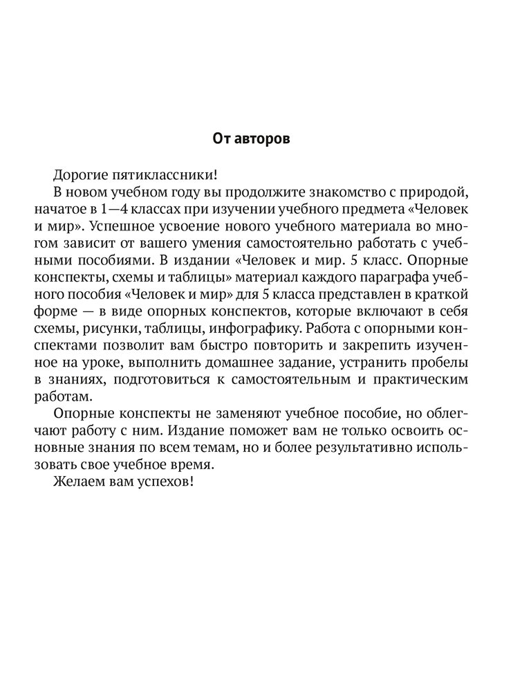 В издании представлен учебный материал по предмету «Человек и мир» для 5 класса в виде опорных конспектов, которые включают в себя схемы, рисунки, таблицы, инфографику. Компактная подача информации позволит быстро повторить и закрепить изученное на уроке, выполнить домашнее задание, устранить пробелы в знаниях, подготовиться к самостоятельным и практическим работам.