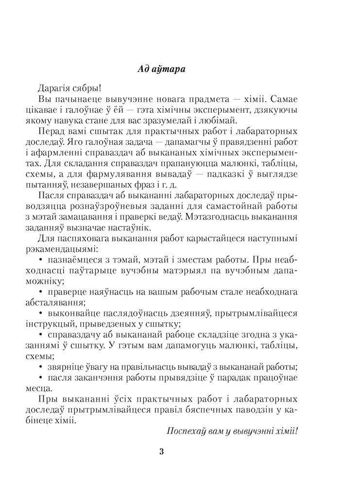 Сшытак з’яўляецца кампанентам вучэбна-метадычнага комплексу па вучэбным прадмеце «Хімія» для 7 класа. У ім змяшчаюцца практычныя работы і лабараторныя доследы, выкананне якіх прадугледжана вучэбнай праграмай, прапануюцца рацыянальныя і эфектыўныя спосабы іх афармлення. Пасля кожнага лабараторнага доследу прыводзяцца рознаўзроўневыя заданні для самастойнага замацавання ведаў.