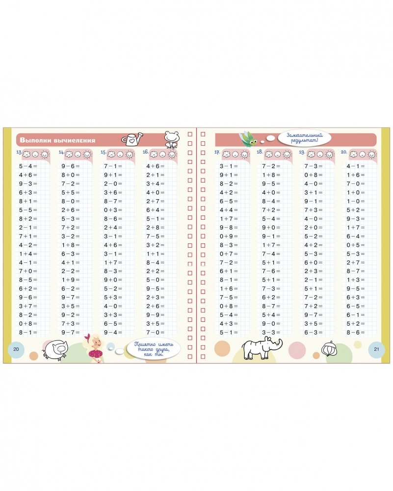 На каждой странице тетрадки «Математика. 1 класс» ребенка будут подбадривать и веселить милые зверюшки, которых, кстати, можно раскрашивать!