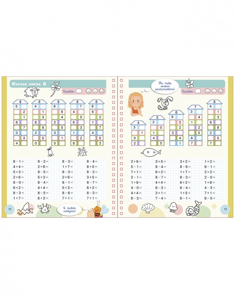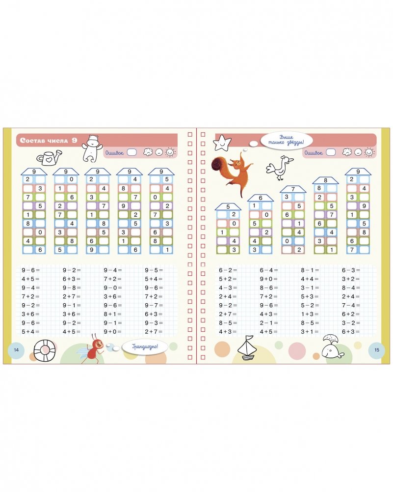 На страницах тетрадки перед первоклашкой будут домики. Каждый домик — это состав числа (от 1 до 10). В окошки домиков ребенок будет вписывать недостающие числа, выстраивая в голове, из чего же состоит 9, а из чего 7 или 5. Рядом с домиками — примеры.
