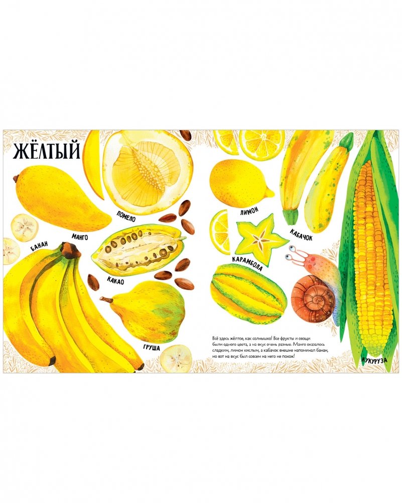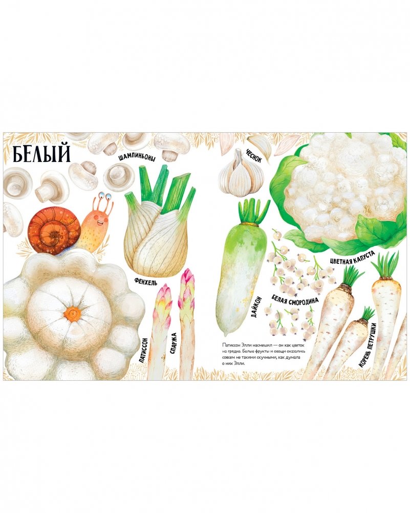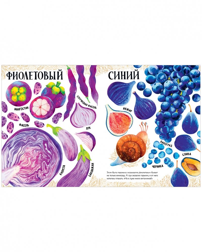 Книга выглядит как визуальный словарь — под каждым рисунком подпись с названием клубники, смородины, банана... Здесь есть не только всем известные яблоки, груши и огурцы, но и редкие артишок и турнепс, и экзотические рамбутан, мангостин и питайя.