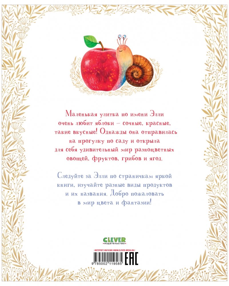 «Приключения улитки Элли в мире фруктов и овощей» — это история малютки, которая жила на яблоне и обожала сладкие яблочки. Но однажды Элли соскользнула с ветки и оказалась на земле! Улитка отправилась в путь и познакомилась с красным арбузом, оранжевой папайей, желтым манго, зеленым лаймом… На каждом развороте малыша ждет новый цвет и удивительно красиво нарисованные фрукты или овощи.