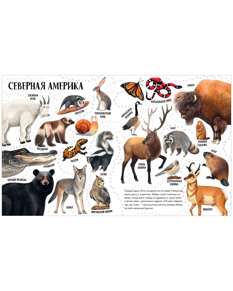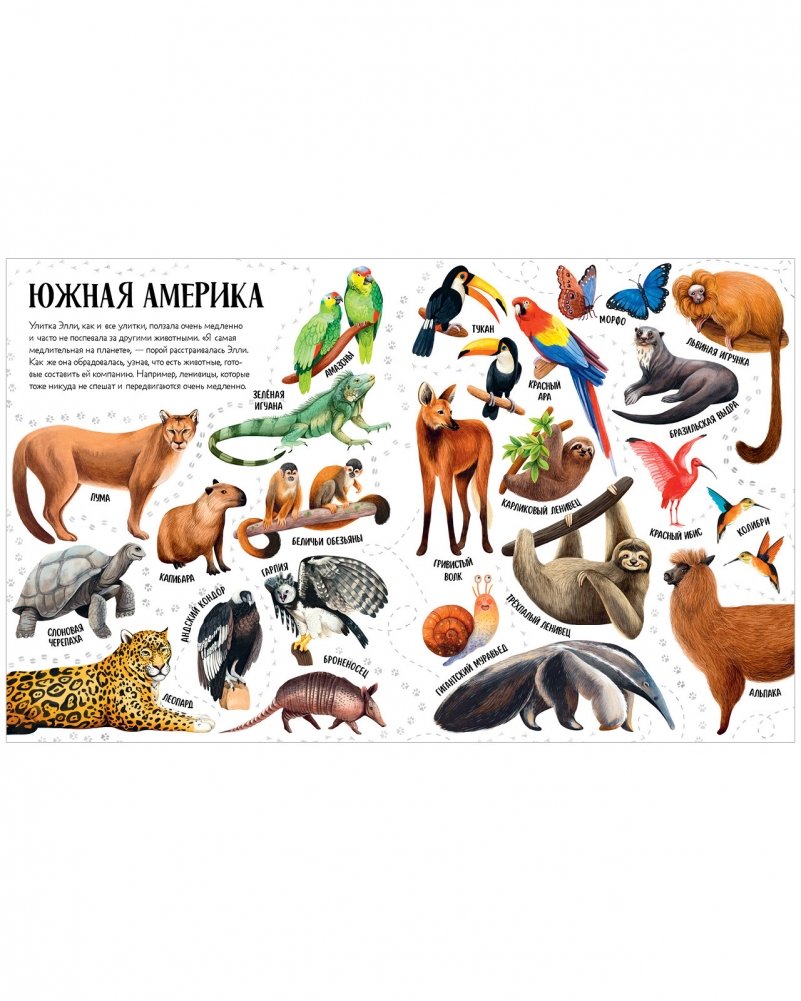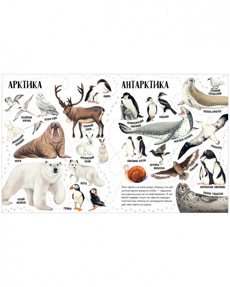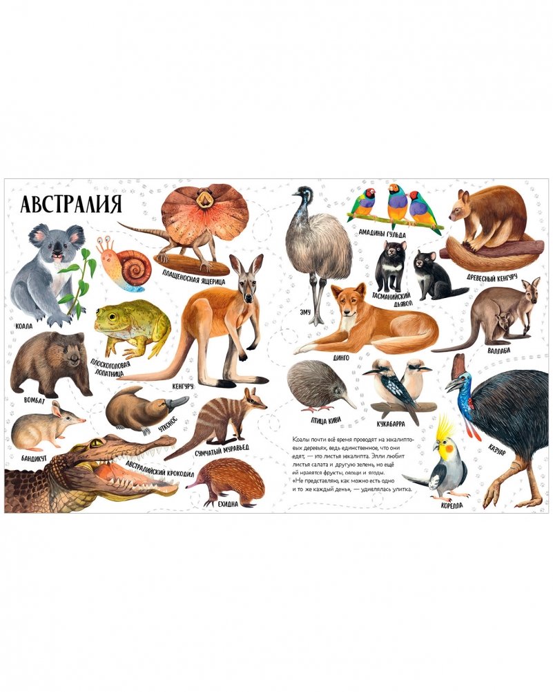 Каждый разворот книги покажет ребенку невероятно красиво нарисованных зверей: европейских — барсука, крота, ежа, лося, азиатских — верблюда, сайгака, ирбиса. А еще аллигатора и скунса из Северной Америки, пуму, капибару и тукана из Южной Америки, коалу и вомбата из Австралии. Жаркая Африка, холодная Антарктика, хищники и травоядные, птицы, жители морей и океанов…
