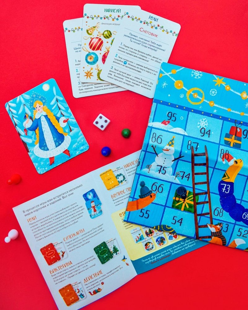 1. Наша семейная игра-бродилка просто создана для уютных зимних вечеров! Любимые герои - Дед Мороз, Снегурочка, Снежная Королева, Щелкунчик, снеговик и олень Рудольф - отправляются на новогодний праздник. Смогут ли они добраться до финиша? И главное - кто победит и станет хозяином новогоднего бала? Зависит только от вас! Скорее бросайте кубик, выполняйте необычные задания и поспешите к финишу!