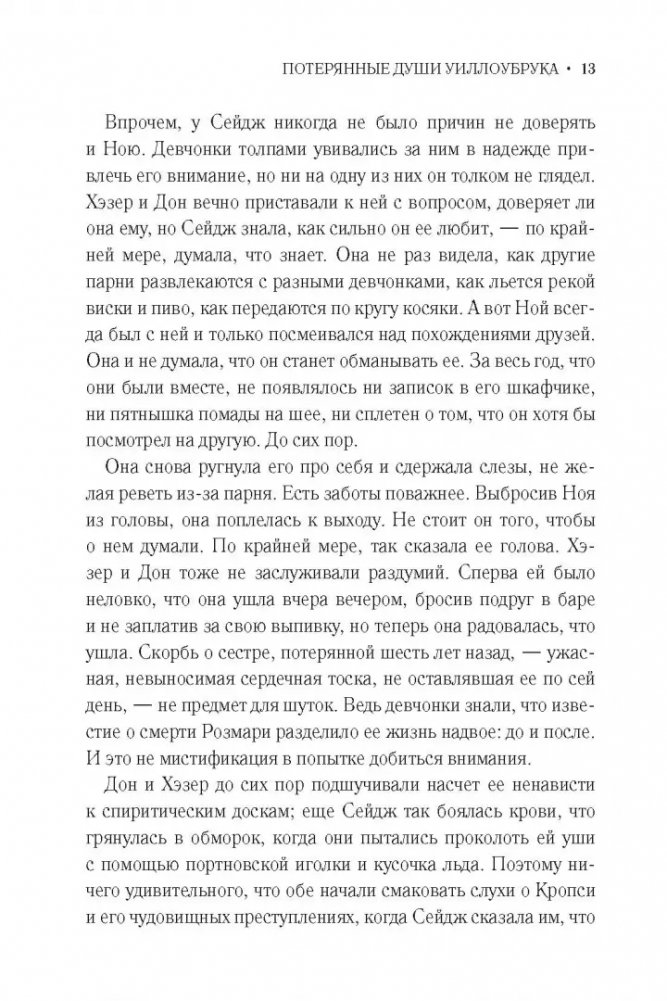 Розмари умерла от пневмонии шесть лет назад, и Сейдж, которой уже исполнилось шестнадцать, все еще по ней скучает. Девушка очень одинока: отец их бросил, мать погибла в автокатастрофе, а отчим Алан с радостью избавился бы от обузы в виде падчерицы. И тем страшнее становится для Сейдж открытие, что ее сестра вовсе не умерла, а была отправлена в Уиллоубрук, печально известное государственное учреждение для неполноценных детей, расположенное на Стейтен-Айленде.