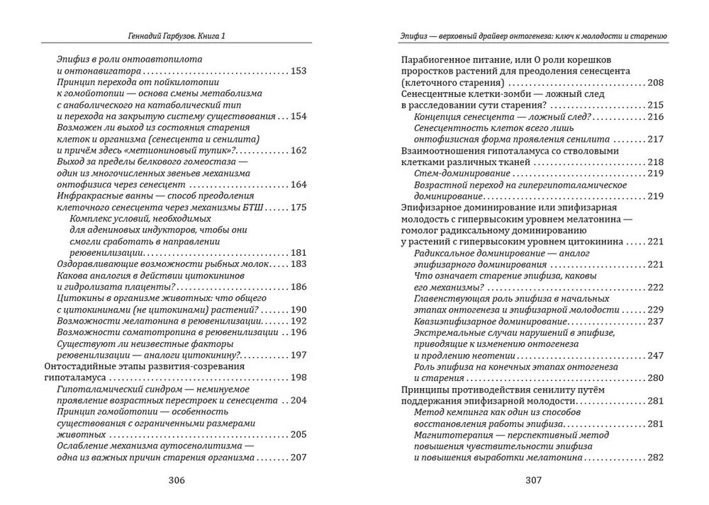 Старение — это многоуровневый процесс как на верхних этажах регулировок (системном), так и на нижнем клеточном. Чтобы адресно разрабатывать методы противодействия и сдерживания общего потока старения (геронтос), необходимо отыскать правильный ответ — откуда исходят истинные, первичные начала этого общего процесса. Автором был проведён глубокий анализ природы старения как в растительном мире, так и в животном. Выявлено, что этот процесс является двусторонним: снизу он исходит на уровне клеток (сенесцент), причиной которого является эпигенетическая коммитация на основе онтофизиса, а также нисходит с верхних этажей, где верховным драйвером данного процесса является эпифиз, а не гипоталамус, как это считалось ранее. Опираясь на фундаментальные разработки, предложен комплекс методик воздействия на все уровни сдерживания процесса старения. Показана динамика взаимовлияния друг на друга верхнего и нижнего этажей старения.