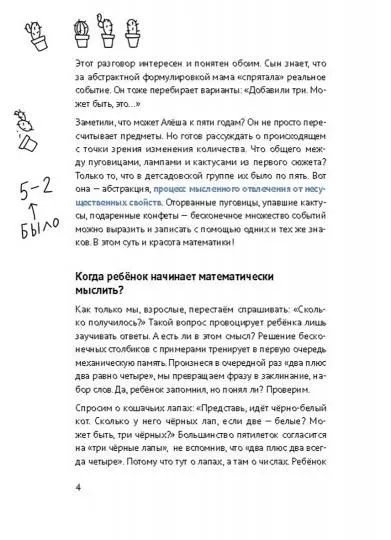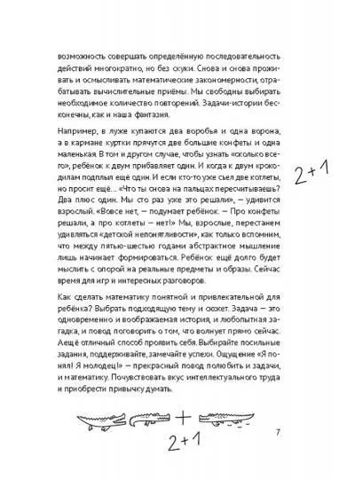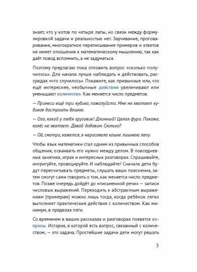 Как подружить дошкольника с математикой? Автор книги - педагог Татьяна Мельникова - рекомендует, прежде всего, отказаться от решения бесконечных столбиков с примерами, которое тренирует только механическое заучивание. В то время как стоит заняться развитием математического мышления: научить малыша наблюдать и действовать, рассуждая "что случилось". Например, с кошкой, которой не дорисовали лапу, или с конфетами, которые неожиданно закончились. Вместе с подобными рассуждениями и разговорами в жизнь малыша сами собой придут первые задачи, как пришли они в жизнь героя книги Алёши и его друга - сенбернара Сени. Вместе с Алёшей и Сеней, а также таксой Аделаидой, бульдогом Хотдогом, спаниелем Мигелем, слонами, жирафами и даже жуками-солдатиками ваш ребёнок научится легко решать первые задачки и по-настоящему полюбит математику. Позаботился автор и о тех, кто помогает малышу: во "взрослой" части книги вы найдёте ответы на возможные вопросы и получите вдохновляющую поддержку в деле обучения математике. Издание для родителей.