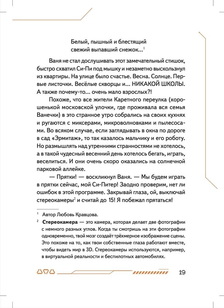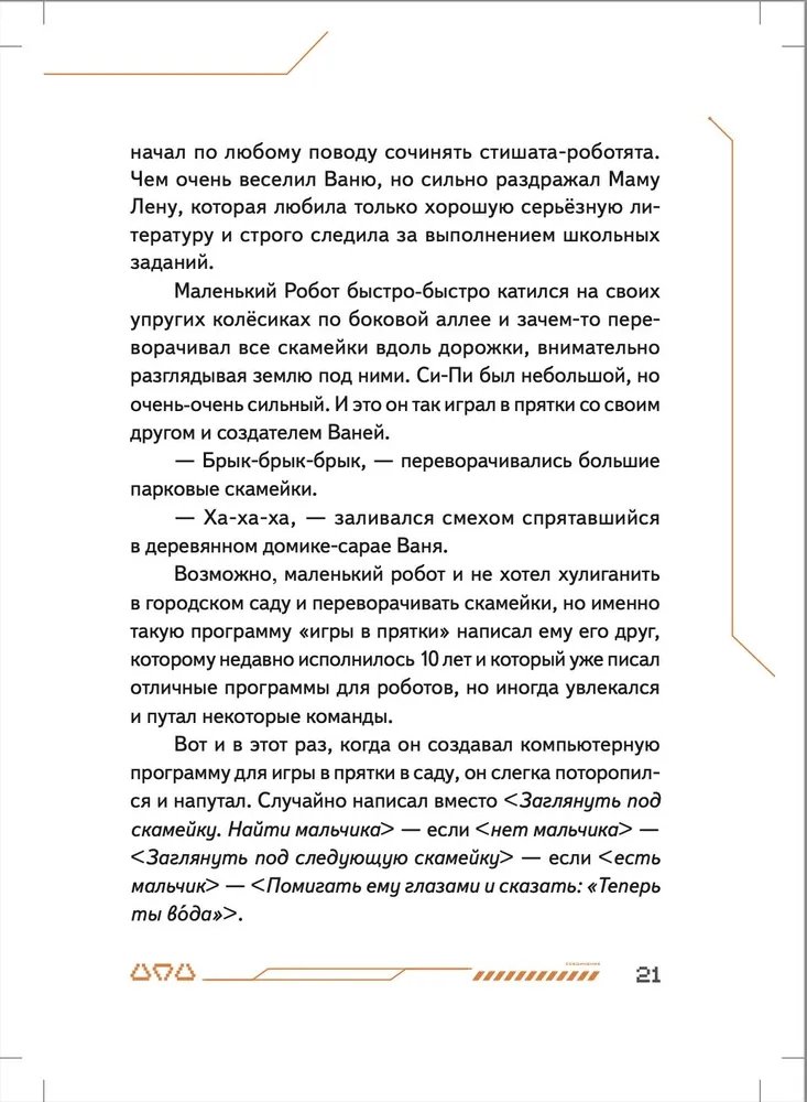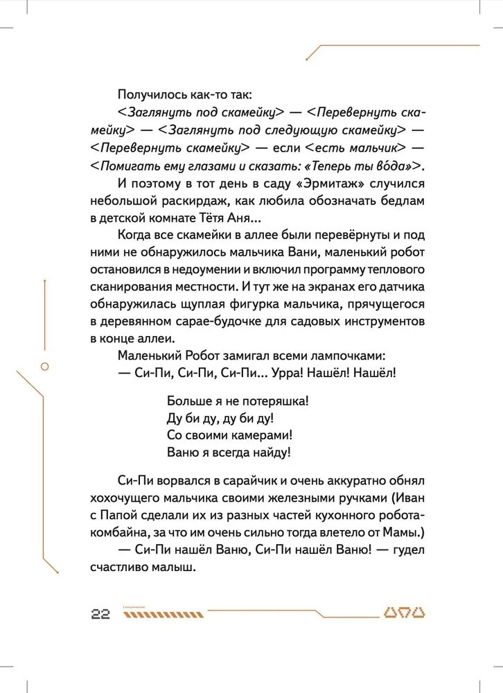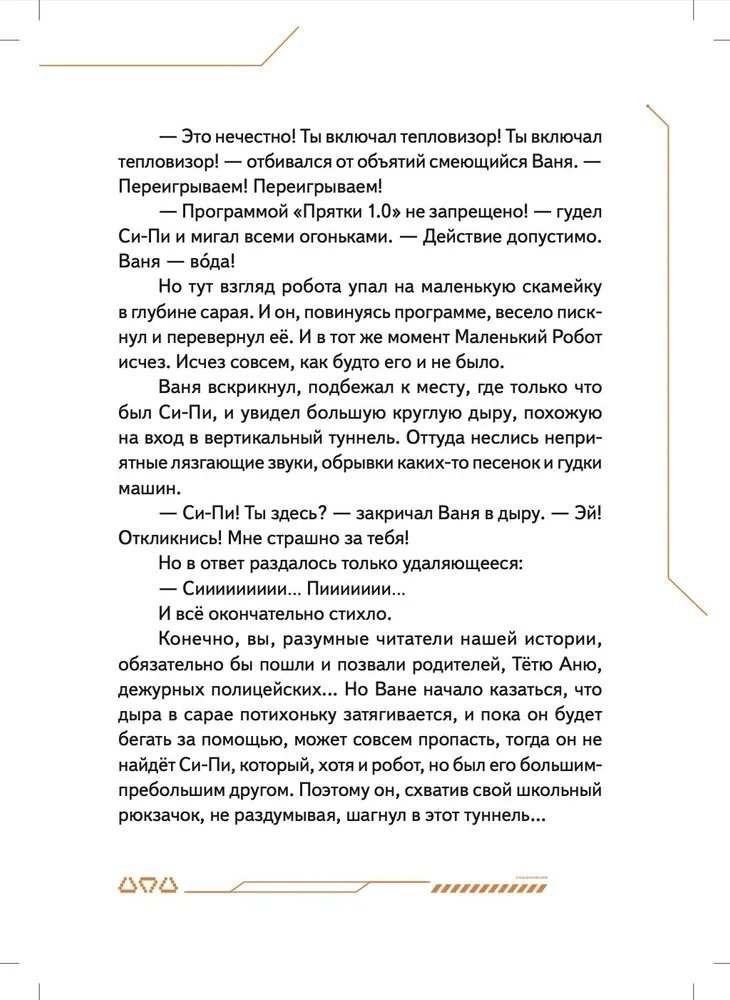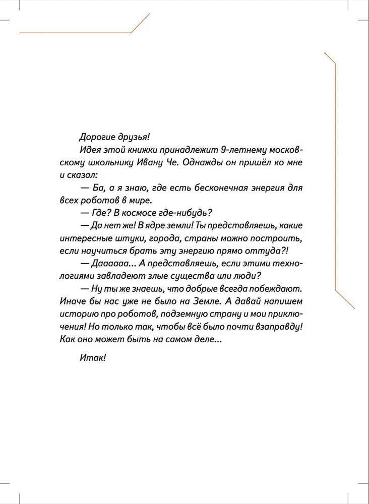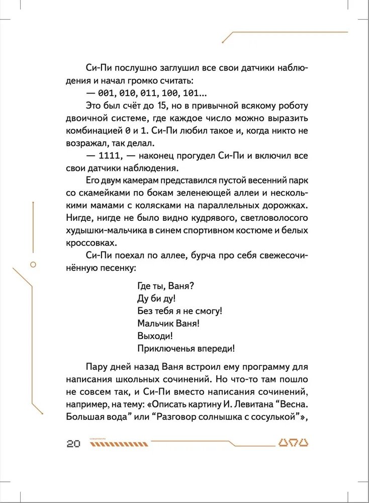 Маленький робот Си-Пи сделан из обычных бытовых приборов мальчиком Ваней и его отцом, но внутри малыша-робота находится одна тайна. Именно она приводит Си-Пи и Ваню в секретную подземную страну Недрусь, населённую роботами и биоботами. С маленькими героями происходит череда головокружительных событий, которые начинаются с истории о разбившемся когда-то на Земле инопланетном корабле и угрозы существования всему человечеству. Судьба двух миров искусственных существ — Голубого и Красного — зависят от того, хватит ли смелости и смекалки у московского мальчика Ивана Че и его маленького робота Си-Пи... Нейрокристаллы и сражение на плазменных мечах, конкурс стихов между носителями Искусственных Мозгов и первая любовь мальчика и девочки-биобота, будущее и настоящее человечества и ответ на вопрос, готов ли робот на самопожертвование, — всё это в новой книге Ольги Усковой, президента Российской компании по производству искусственных мозгов для роботов «Когнитив Пилот», и автора взрослых книжек-бестселлеров про искусственный интеллект «Этюды Черни» и «Раша».