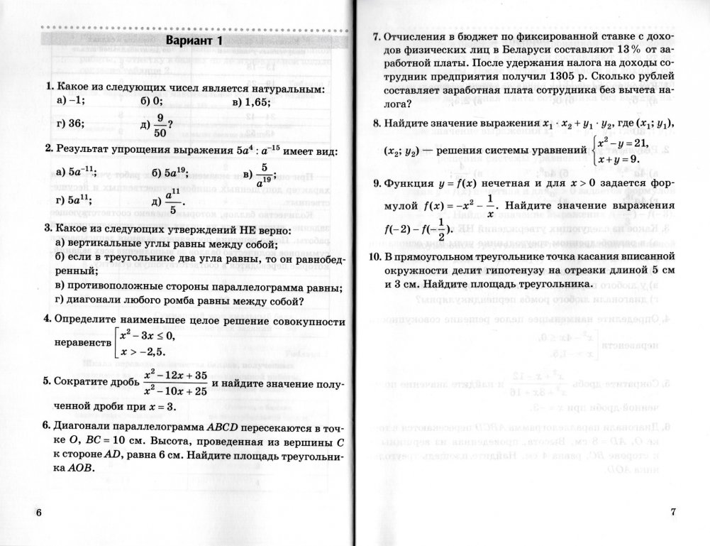 Задания сгруппированы по вариантам. В каждом варианте представлено 10 заданий (по два задания, соответствующие каждому уровню учебной деятельности), которые включают задания алгебраического и геометрического компонентов.