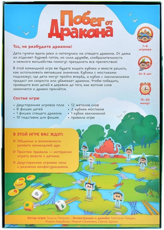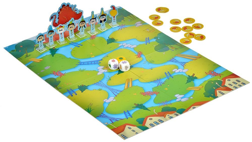 Дети гуляли вдоль реки и наткнулись на спящего дракона. От дома их отделяет бурный поток, но сила дружбы, сообразительность и немного волшебства помогут преодолеть все препятствия! В этой командной игре вы будете кидать кубики и вместе решать, как использовать выпавшие значения. Кубики с мостиками подскажут, где дети могут пройти вперёд, а кубик с заклинаниями придаст им скорости или убаюкает дракона. Чтобы победить, приведите всех детей в деревню до того, как жетоны снов закончатся и дракон проснётся.