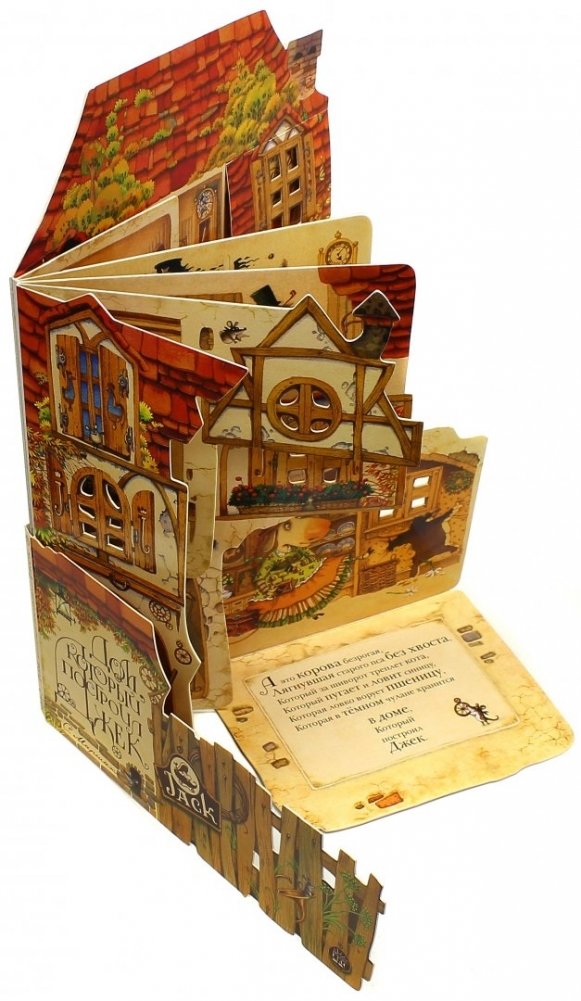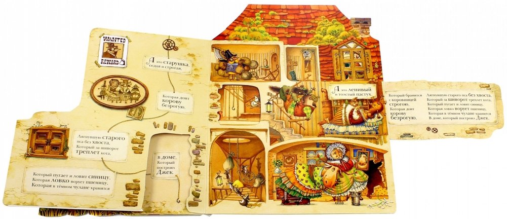 И всё здесь, как в настоящем доме - и резные окошки, и тёмный чулан, в котором пшеница хранится, и чердак, откуда строит козни птица-синица, и лесенки, по которым снуют туда-сюда неугомонные обитатели, и уютная комнатка, где корова безрогая и молочница строгая спасаются от… Впрочем, это секрет. История почти детективная, с ограблениями и преследованиями, безупречно переведённая Самуилом Маршаком и остроумно нарисованная Ольгой Попугаевой и Дмитрием Непомнящим.