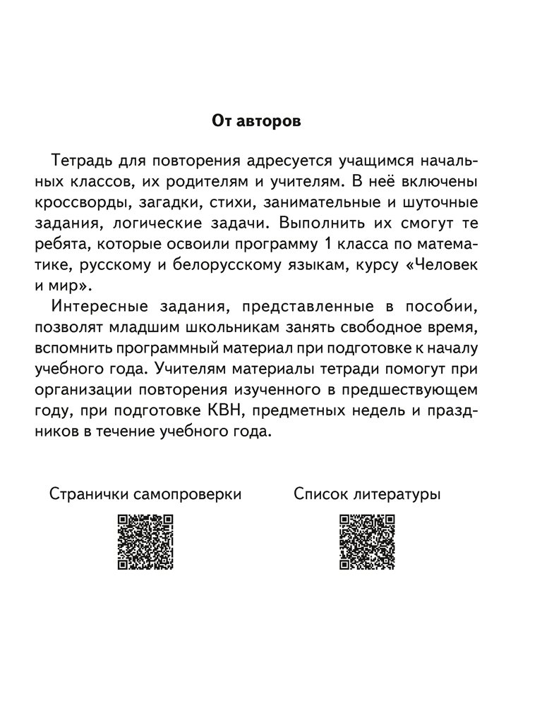 Тетрадь для повторения включает интересные и занимательные задания по предметам «Математика», «Русский язык», «Беларуская мова», «Человек и мир». Предлагаемые материалы помогут школьникам занять свободное время, повторить изученное в предыдущем классе и подготовиться к началу нового учебного года.