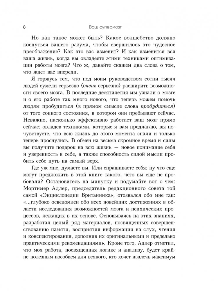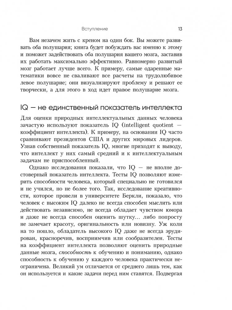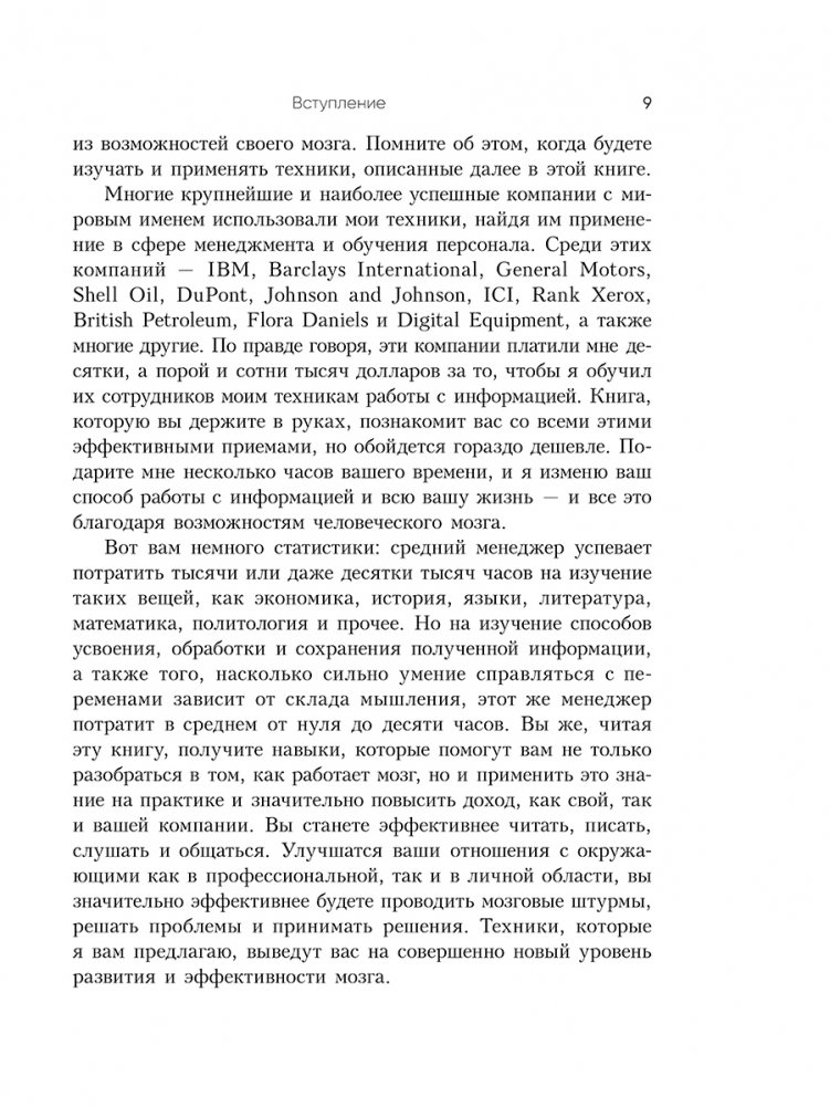 Книга представляет его авторские методики и техники, которые научат вас больше запоминать, мыслить четче и креативнее, решать сложные задачи, быстрее читать и эффективнее усваивать учебные материалы. Помимо прочего вы узнаете: