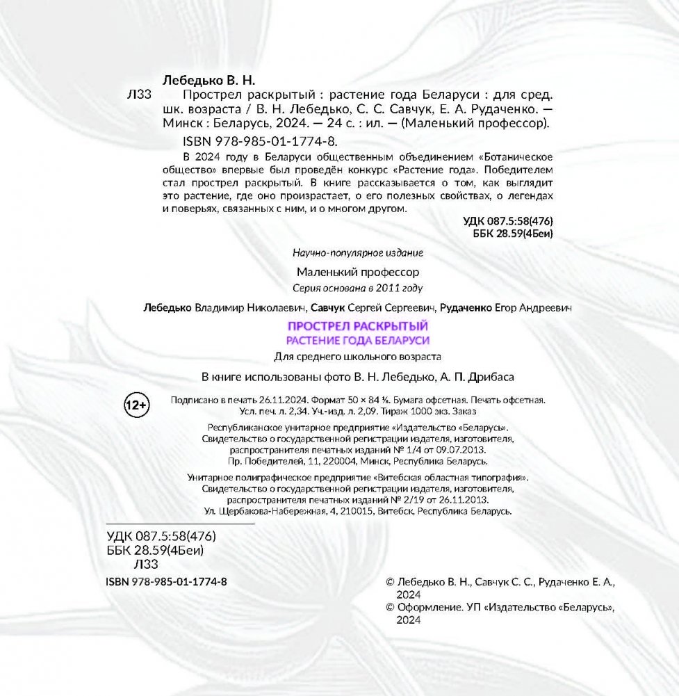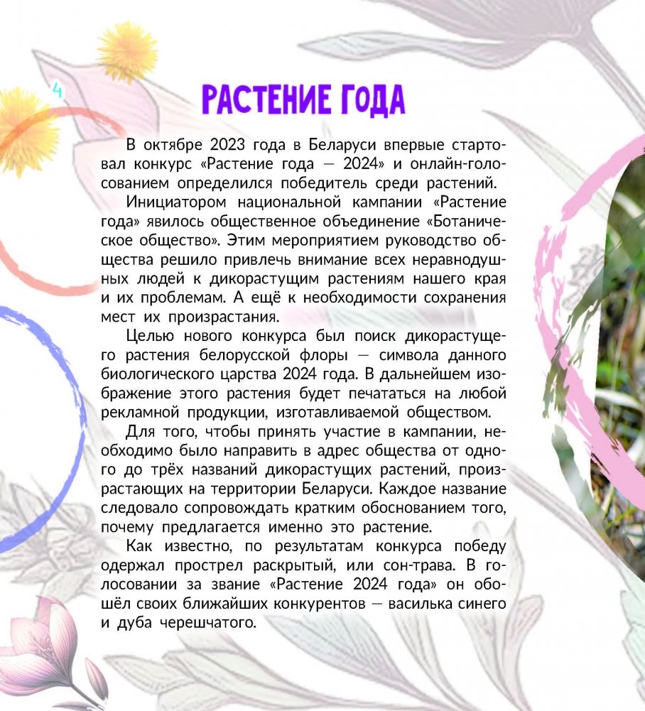 В 2024 году в Беларуси общественным объединением «Ботаническое общество» впервые был проведён конкурс «Растение года». Победителем стал прострел раскрытый. В книге рассказывается о том, как выглядит это растение, где оно произрастает, о его полезных свойствах, о легендах и поверьях, связанных с ним, и о многом другом.