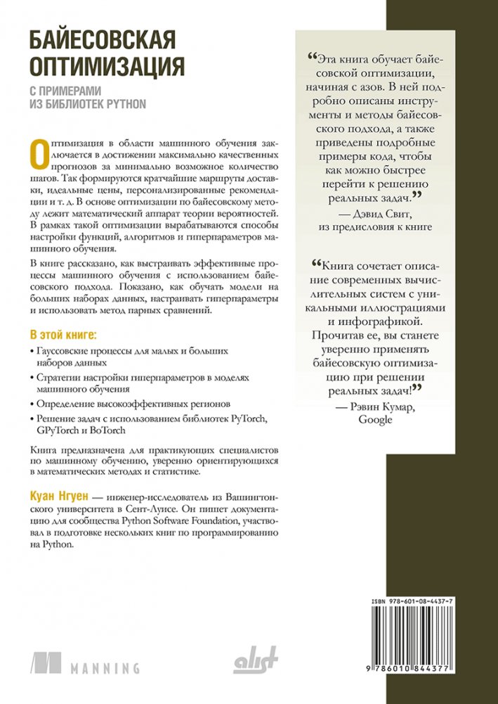 Книга рассказывает об оптимизации моделей машинного обучения на основе байесовского метода и теории вероятностей. Примеры составлены на языке Python с использованием библиотек PyTorch, GPyTorch и BoTorch. Описаны приемы настройки гиперпараметров, гауссовское распределение, использование политик машинного обучения, в частности на основе задачи о многоруких бандитах, повышение производительности вычислений, многовариантная оптимизация с учетом полезности и затрат, а также применение байесовского метода в специализированных сценариях.