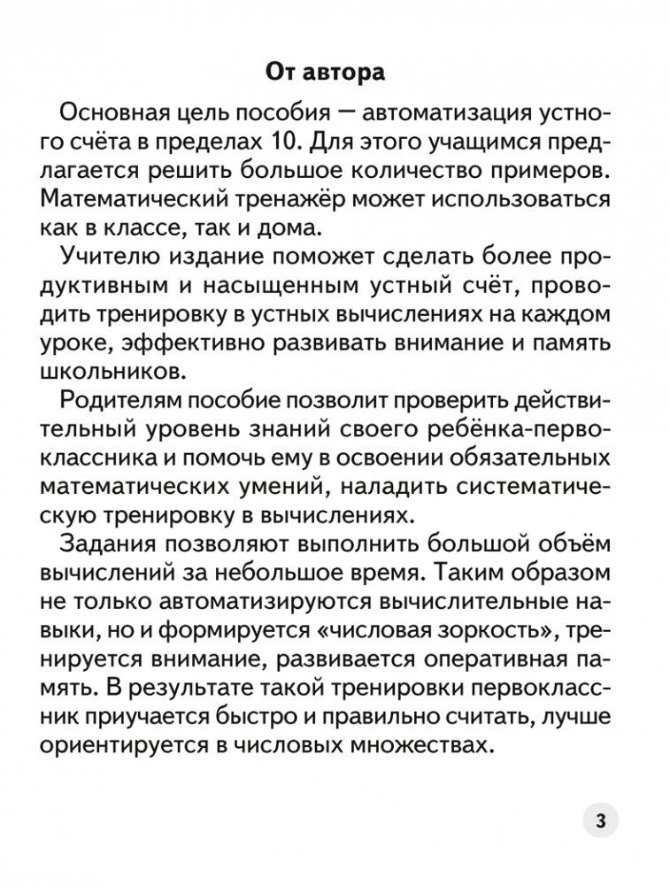 Пособие предназначено для автоматизации устного счёта в пределах 10. При выполнении заданий не только отрабатываются вычислительные навыки, но и формируется «числовая зоркость», тренируется внимание, развивается оперативная память ребёнка. Тренажёр можно использовать для работы как в классе, так и дома.