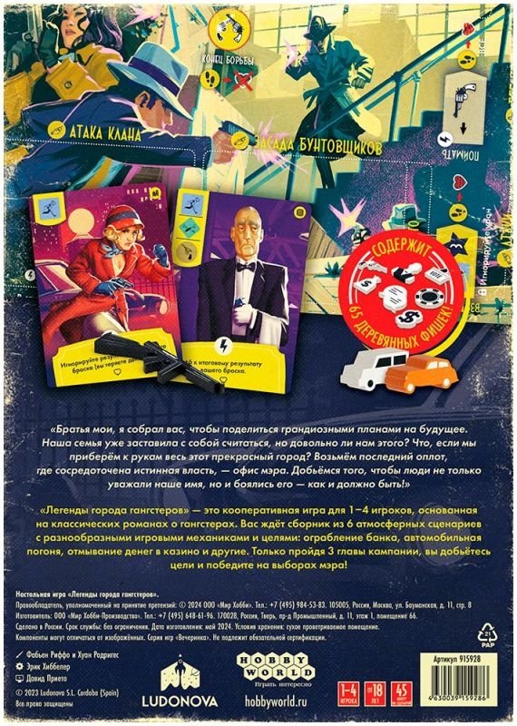"Легенды города гангстеров" – это кооперативная игра для 1‒4 игроков, основанная на классических романах о гангстерах. Вас ждёт сборник из 6 атмосферных сценариев с разнообразными игровыми механиками и целями: ограбление банка, автомобильная погоня, отмывание денег в казино и другие. Только пройдя 3 главы кампании, вы добьётесь цели и победите на выборах мэра!