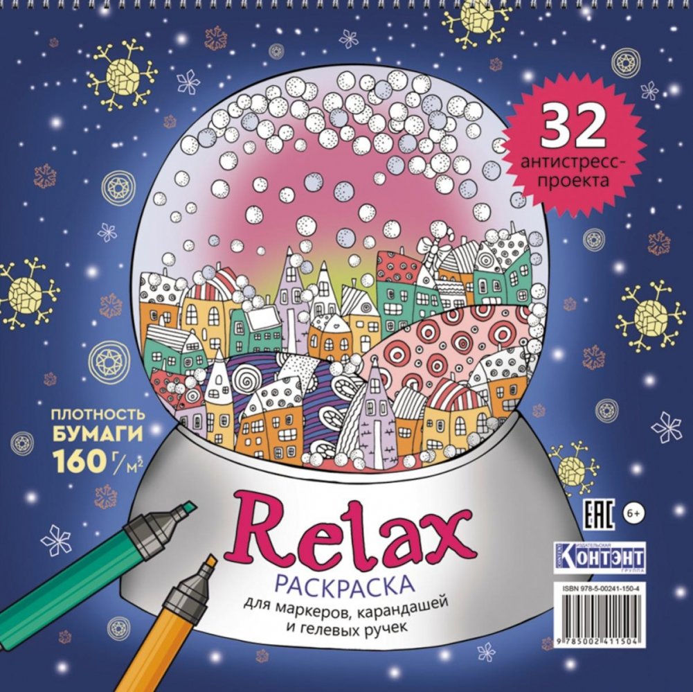 Раскраска Relax для работы маркерами, цветными карандашами и гелевыми ручками — это творчество и антистресс под одной обложкой.