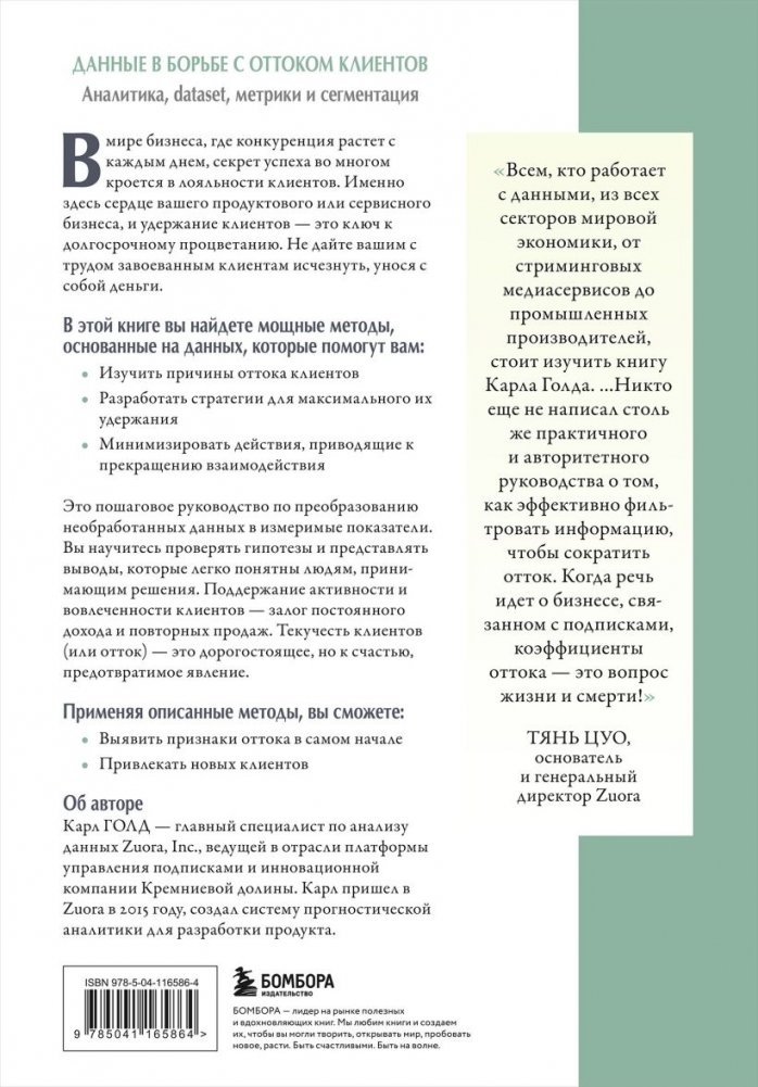 Книга "Данные в борьбе с оттоком клиентов. Аналитика, dataset, метрики и сегментация" предлагает уникальную возможность овладеть методами удержания клиентов, опираясь на силу аналитики и данных. В современном бизнесе, где конкуренция ужесточается, понимание причин оттока клиентов и разработка стратегий его предотвращения критически важны. Вы научитесь преобразовывать необработанные данные в практичные и измеримые показатели, легко проверять гипотезы и делать понятные выводы; узнаете, как использовать искусственный интеллект для точного прогнозирования вовлеченности клиентов.