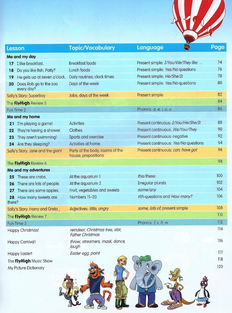 Fly High is a motivating four-level course for young learners that integrates reading, grammar, writing, listening, and speaking skills in a fun and engaging way. Language is presented in humorous cartoon stories and follows the adventures of the Fly High characters. • Games and songs are used to consolidate language and a 'Reading for Pleasure' story develops reading skills and recycles language in a new context • The Activity Book and Pupil's CD-ROM with interactive songs and games offer further opportunities for consolidation and revision • Additional teacher resources include flashcards, photocopiable worksheets and posters • The Active Teach CD-ROM provides an Interactive version of the Pupil's Book that turns Fly High into a dynamic multimedia teaching tool Language is presented through engaging cartoon stories featuring likeable characters: Cabu the lion, Trumpet the elephant, and Paco the parrot.
