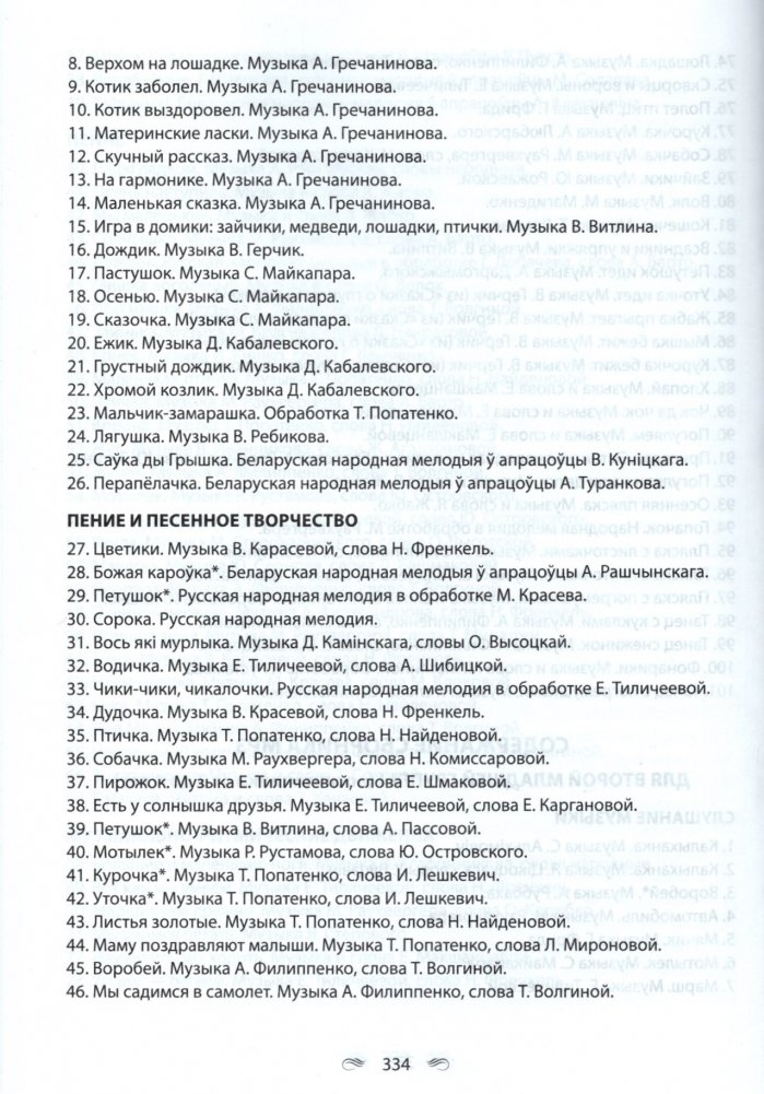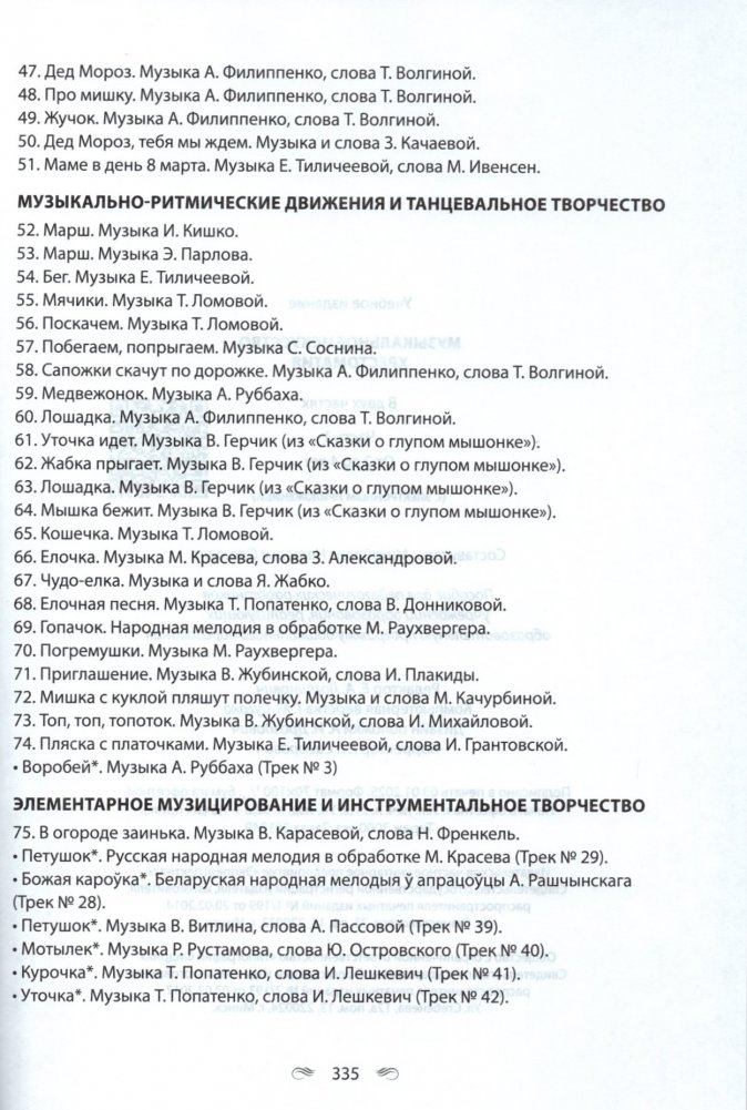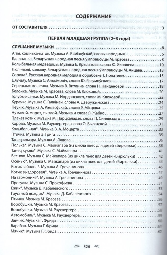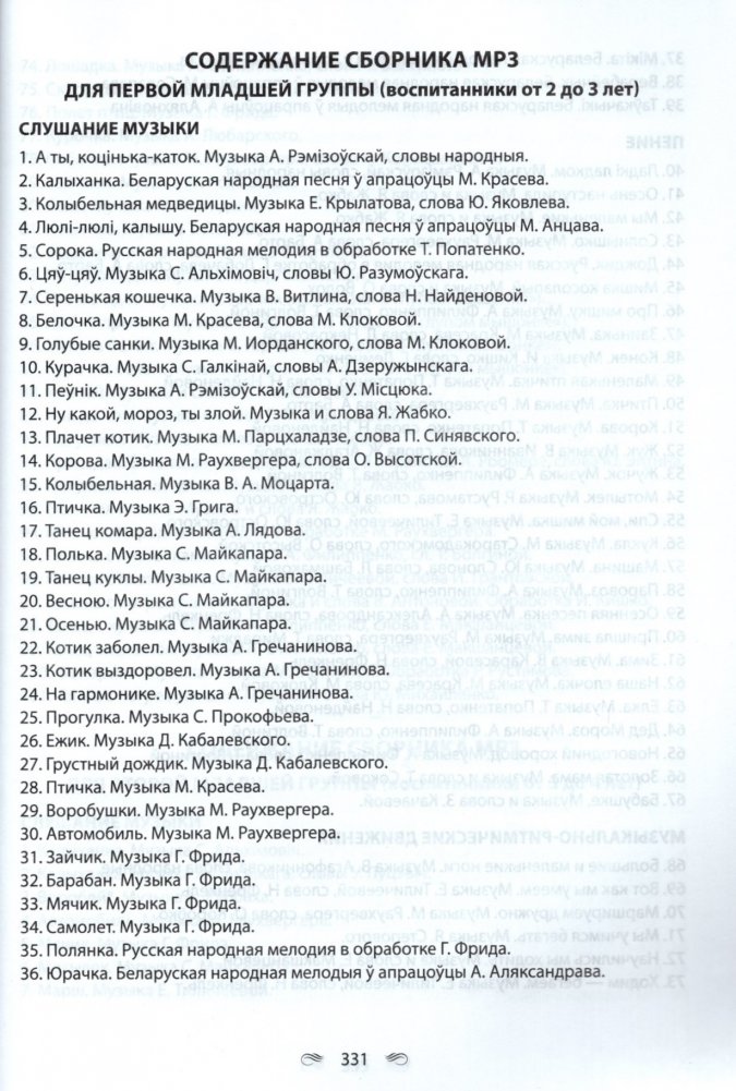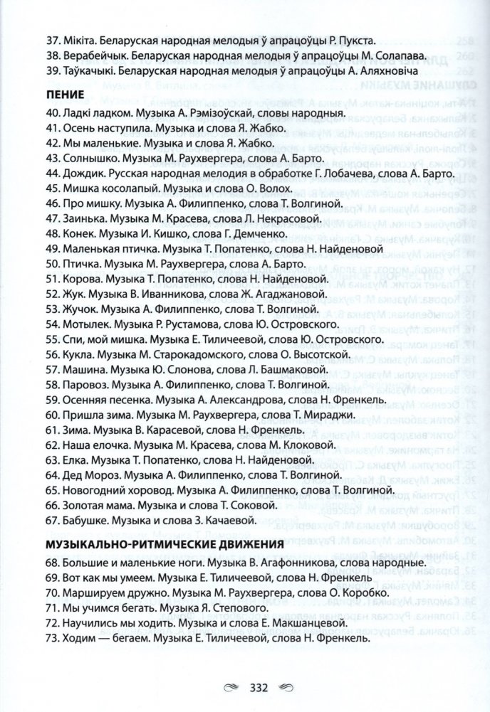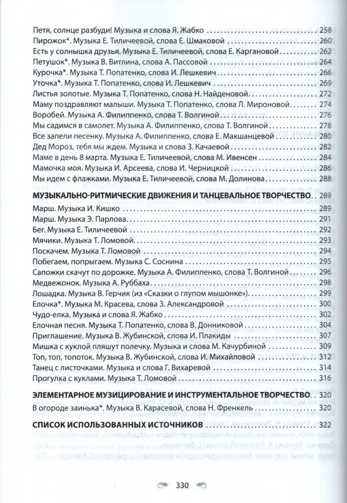 Пособие включает музыкальный репертуар, рекомендуемый учебной программой дошкольного образования по образовательной области "Музыкальное искусство" (слушание музыки, пение, пение и песенное творчество, музыкально-ритмические движения, музыкально-ритмические движения и танцевальное творчество, элементарное музицирование, элементарное музицирование и инструментальное творчество) для воспитанников от 2-х до 4-х лет.