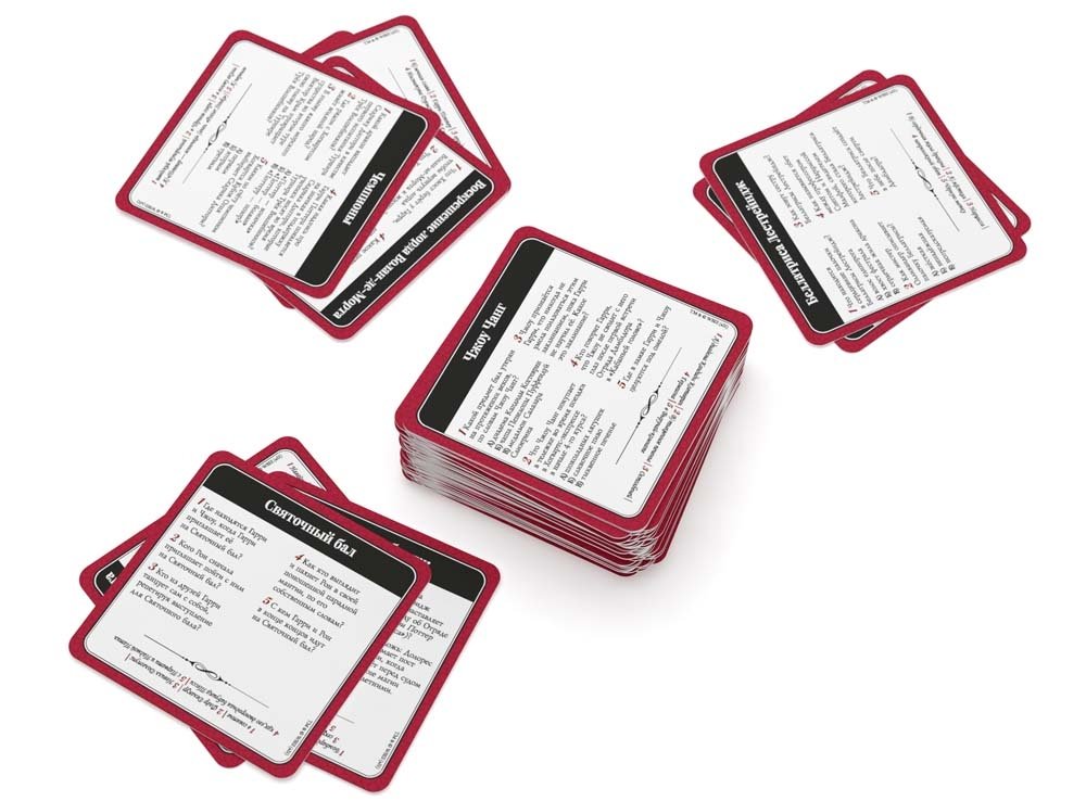 В состав настольной игры Гарри Поттер. Викторина входит: 50 двусторонних карточек с вопросами, и правила игры.