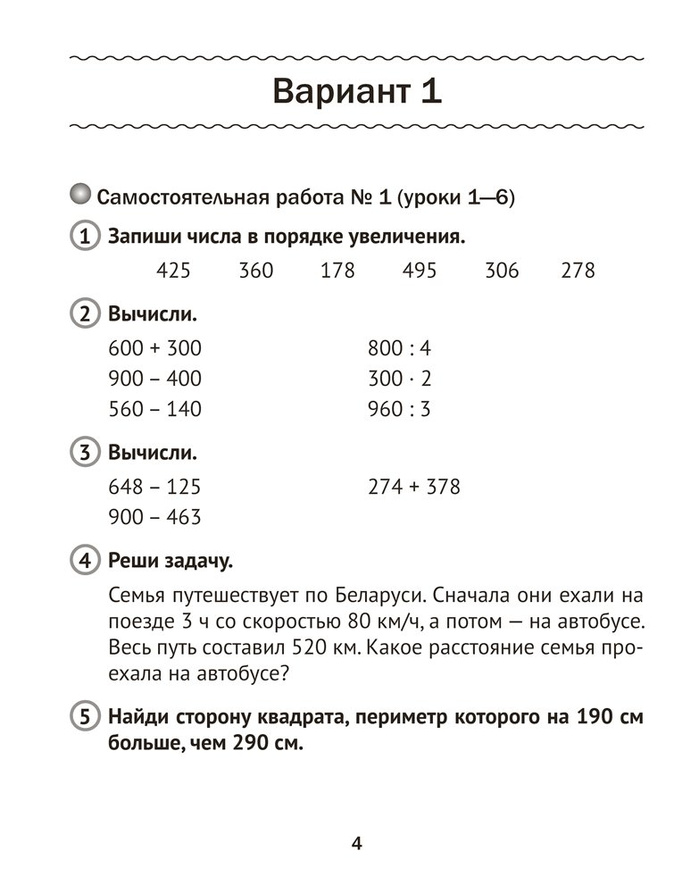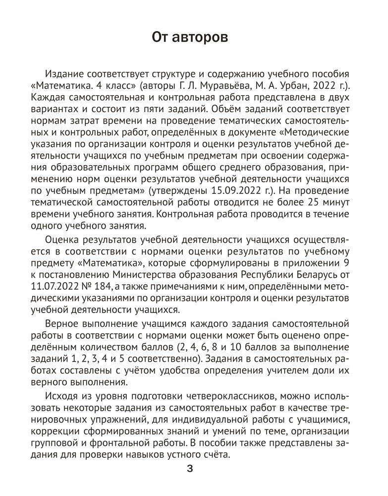 Пособие составлено в соответствии с учебной программой. Каждая самостоятельная и контрольная работа представлена в двух вариантах и соотносится с содержанием учебного пособия «Математика. 4 класс» (авторы Г. Л. Муравьёва, М. А. Урбан). В издании также приведены задания для проверки навыков устного счёта.