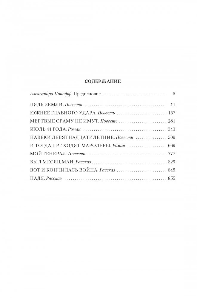 Григорий Бакланов — советский писатель, сценарист и публицист, фронтовик, один из ярких представителей «лейтенантской прозы», среди которых Виктор Астафьев, Юрий Бондарев, Василь Быков, Борис Васильев, Виктор Некрасов… В 1941 году, когда Бакланову было 17 лет, он добровольцем ушел на фронт, участвовал в боях на Украине, в Молдавии, Румынии и Венгрии; конец войны застал его в Австрии, в звании младшего лейтенанта. Достоверные эпизоды войны, отраженные в произведениях Бакланова, часто шли вразрез с парадной историей, но несли правду, которую автор хотел рассказать о том, что видел и пережил. «Новые поколения не представляют себе, что же такое в свое время, в конце 50-х — начале 60-х, была так называемая „лейтенантская проза“, — вспоминал Бакланов. — Это был, в первую очередь, свой взгляд на войну, писали о том, что сами вынесли с полей сражений, правду делали достоянием всех». В настоящее издание вошли самые известные произведения Григория Бакланова, написанные в разные годы, включая ранние военные повести «Южнее главного удара» и «Пядь земли», роман «Июль 41 года», рассказы «Был месяц май», «Вот и кончилась война» и «Надя».