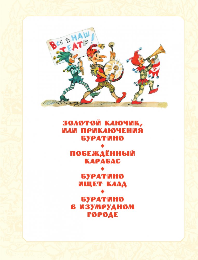 А. Н. Толстой в детстве читал сказку Карло Коллоди "Приключения Пиноккио. История деревянной куклы". Ему настолько полюбилась эта сказочная повесть, что он решил пересказать её для советских детей. В 1935 году вышла книга "Золотой ключик, или Приключения Буратино". С тех пор озорной деревянный мальчишка Буратино стал известным сказочным персонажем. По сказке ставятся пьесы, снимаются фильмы, рисуются мультфильмы. Читателей интересовало, что же случилось с Буратино и его друзьями дальше. В 1941 году писательница Елена Данько написала продолжение приключений Буратино "Побеждённый Карабас". Буратино в полосатом колпачке нарисовал художник Л. В. Владимирский. Теперь этот образ стал классическим.Иллюстрации Л. В. Владимирского к "Золотому ключику, или Приключениям Буратино" считаются лучшими. Художнику настолько полюбился деревянный мальчишка, что он не прекращал его рисовать. А потом сочинил по своим картинкам новые истории: "Буратино ищет клад" и "Буратино в Изумрудном городе". В книгу вошли все истории о приключениях Буратино с рисунками Л. В. Владимирского.