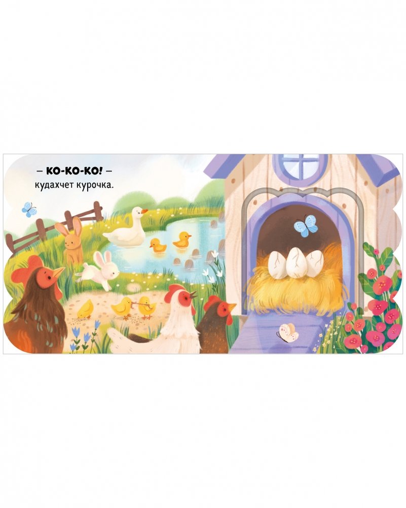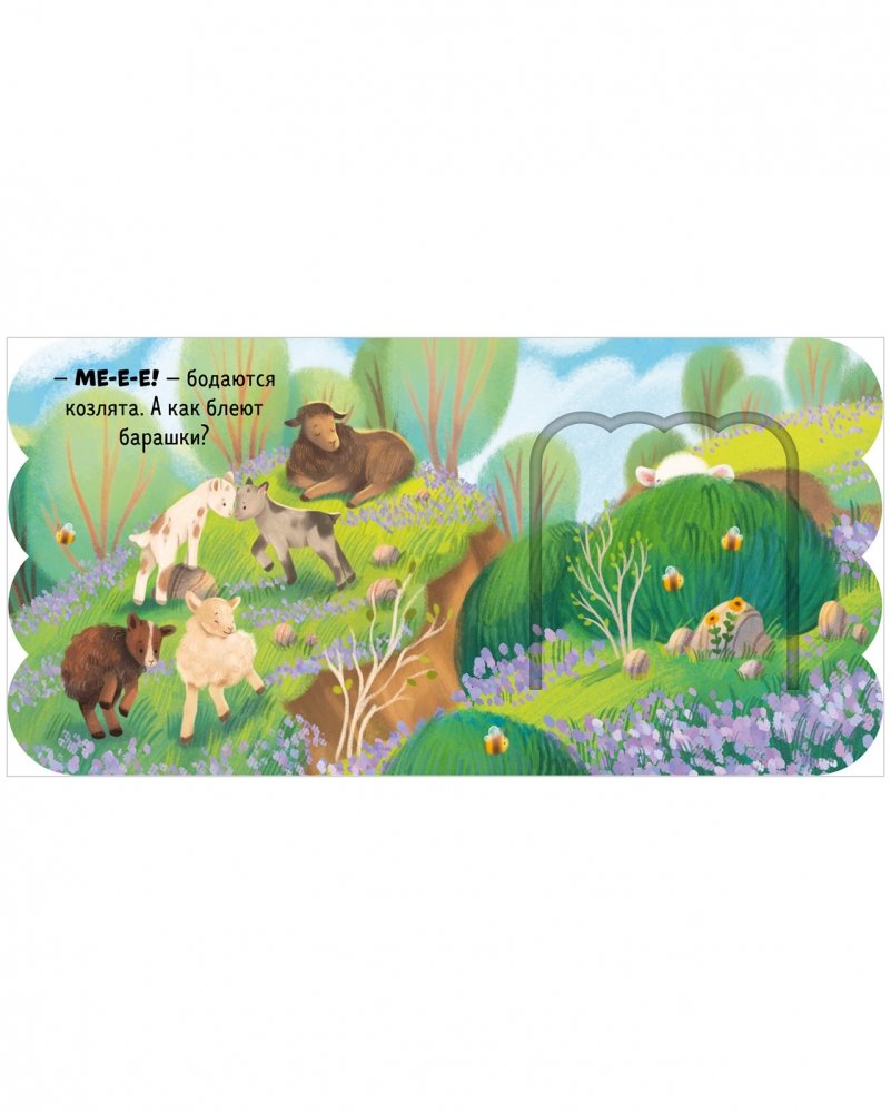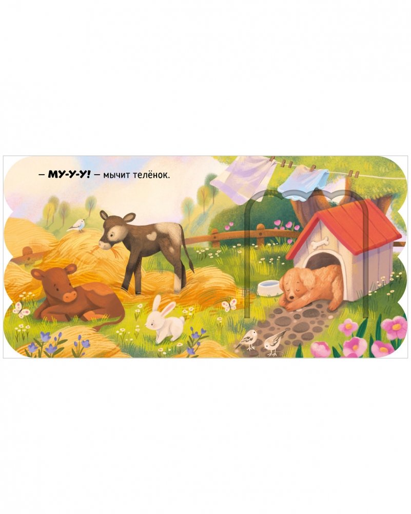 На каждом развороте маленький читатель найдет панорамную иллюстрацию, вопрос на сообразительность («Как хрюкают поросята?») и ответ, который спрятался в окошке («Хрю-хрю!»).