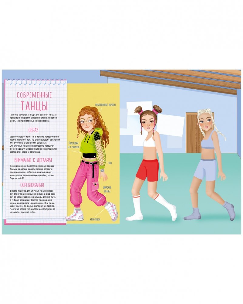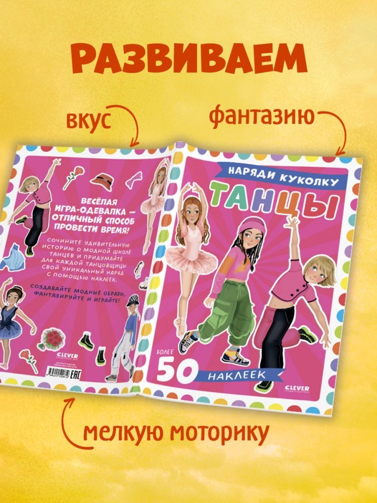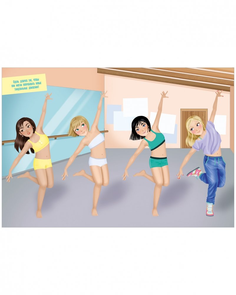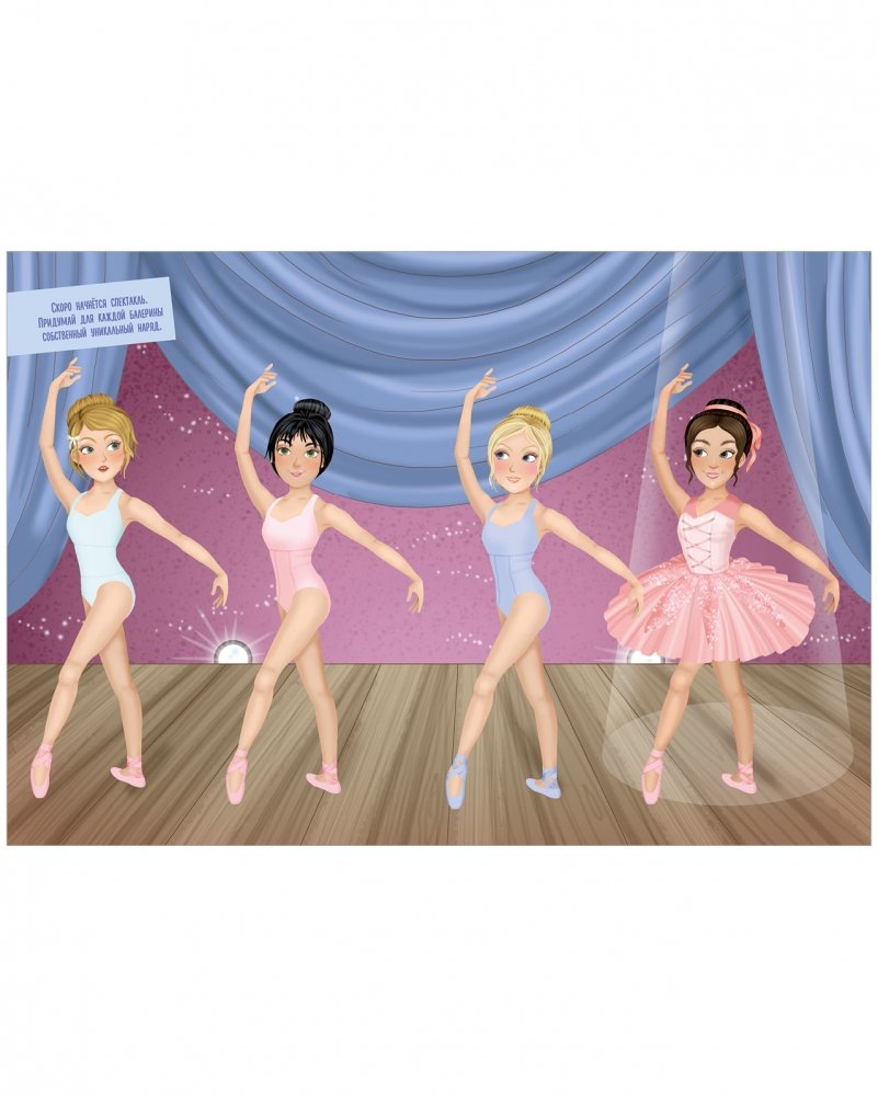 Более 50 стикеров позволят придумывать наряды и одевать милых подружек-балерин и танцовщиц прямо в книге.