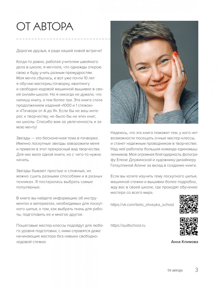 Эта книга посвящена звездам! Самые притягательные дизайны в лоскутном шитье никого не оставляют равнодушными. Они могут быть выполнены на основе базовых блоков и самых простых приемов, могут быть собраны по бумажным шаблонам или вручную. В книге - все виды и варианты звезд, и для каждого вида – полная обучающая информация и роскошное авторское изделие, которое вы сможете воспроизвести по урокам замечательного мастера Анны Климовой! А еще инструменты материалы, цвет и композиция, способы подбора ткани, ее подготовка к работе, выполнение ручной и машинной сборки, изделия на основе базовых блоков, и изделия сложной конфигурации, сшитые по бумажной основенеобходимые для лоскутного шитья, алгоритм построения, пошаговый разбор последовательности сборки, полноразмерные выкройки к сложным лоскутным изделиям, арианты стежки лоскутных изделий и обработки срезов и много чего еще, что сделает из вас настоящего продвинутого мастера!