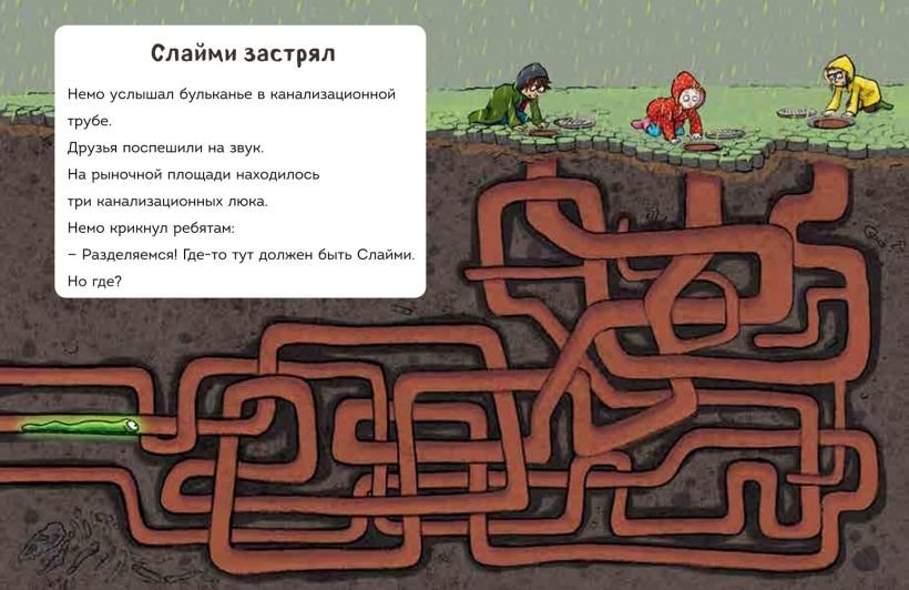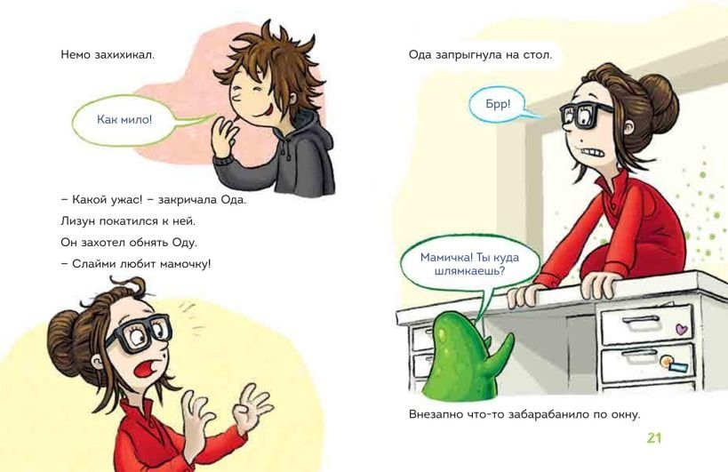 Изложение популярной истории "Таинственная посылка" в формате "Первое чтение": короткие предложения и простые слова. Немо снова получил таинственную посылку, в которой оказался говорящий зелёный липкий лизун. Стоило ему выбраться из коробки, как над Нудингом пошёл ужасный ливень из слизи! Поэтому, пока не поздно для всего городка, Немо и его друзьям Фреду и Оде нужно срочно найти настоящего хозяина Слайми.