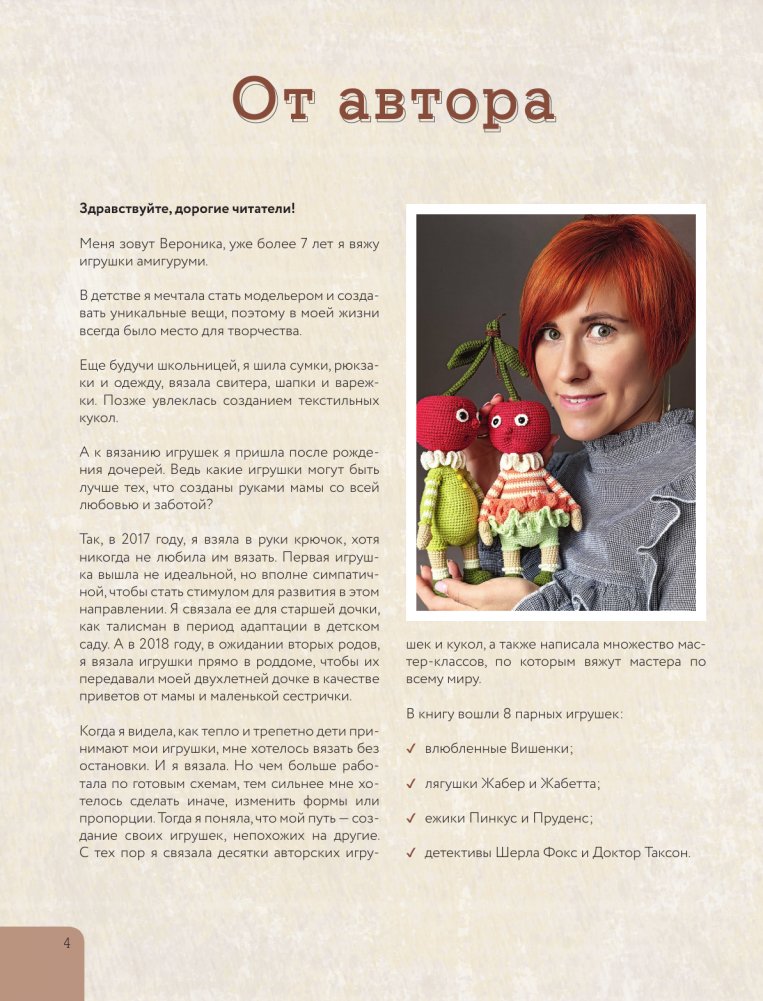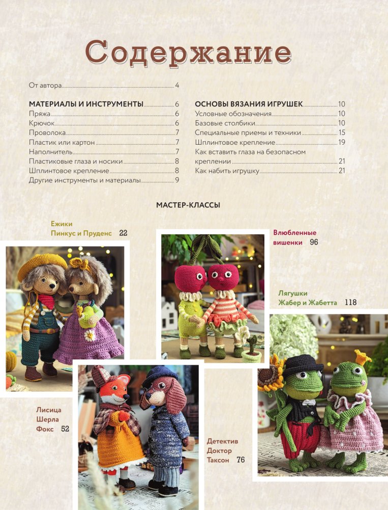 В книгу вошли 5 мастер-классов. Вы сможете связать влюбленных вишенок, лягушек Жабера и Жабетту, ежиков Пинкуса и Пруденс, детективов Шерлу Фокс и Доктора Таксона. Все мастер-классы содержат пошаговые фотографии и подробное описание вязания каждого персонажа, чтобы создавать их было легко и интересно. Игрушки не только подойдут детям, но и станут украшением интерьера или тематическим подарком для взрослого человека. Также автор подробно разобрал все необходимые для работы материалы и инструменты, описал основные приемы и техники выполнения всех элементов. Внутри книги вы также найдете подарок: дополнительный мастер-класс по вязанию снеговика и снежки!