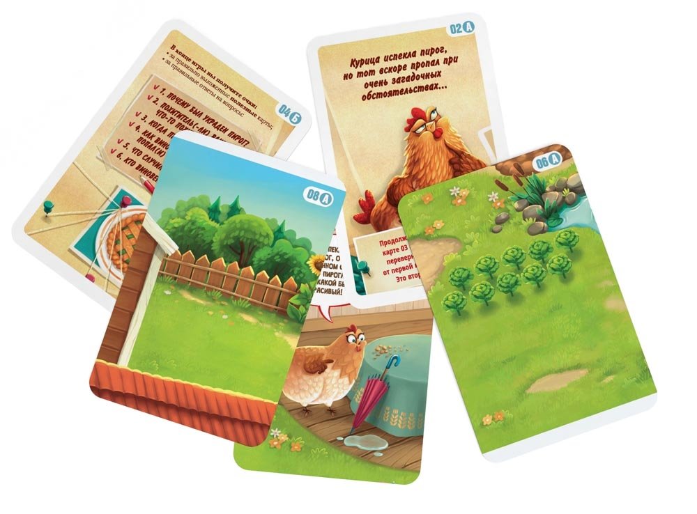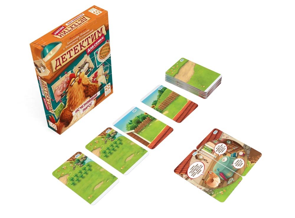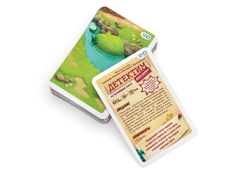 В состав настольной игры Детектим для семьи: Исчезнувший пирог входят: 44 карточки, правила игры.