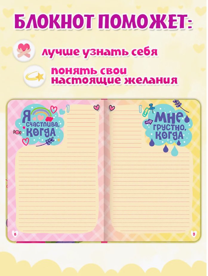 «Книга моих секретов» - это серия дневничков для девочек с четырьмя яркими обложками и единым блоком. Обложки со скруглёнными углами выполнены с добавление поролона, что придаёт им толщину и мягкость. В блоке 96 страниц с яркими принтами и различными тематическими разделами, чтобы помочь девочкам систематизировать свои мысли, а так же разлинованные страницы для самостоятельного заполнения. Новая серия дневников для девочек – это не просто записная книжка, это волшебное место, нечто очень личное, где девочки могут выразить свои мысли, чувства и рассказать о важных событиях в своей жизни, мечтах.