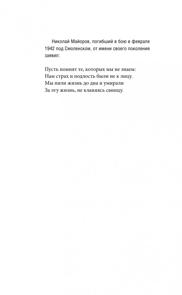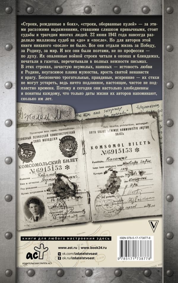 "Строки, рожденные в боях", "строки, оборванные пулей" - за этими расхожими выражениями, ставшими слишком привычными, стоят судьбы и трагедии многих людей. 22 июня 1941 года навсегда разделило миллионы судеб на "до" и "после". Но для авторов этой книги никакого "после" не было. Все они отдали жизнь за Победу, за Родину, за мир. И все они были поэтами, не по профессии – по духу. Их опаленные войной строки читали в окопах и блиндажах, печатали в газетах, перечитывали в полных нежности письмах. В этих строках, зачастую неумелых, наивных – истовость любви к Родине, неугасимое пламя мужества, ярость святой ненависти к врагу. Бесконечно трогательные, правдивые, искренние – их стихи не могут устареть, ведь ничто подлинное, настоящее, чистое не подвластно времени. Потому и сегодня они настолько злободневны и понятны каждому, что только даты жизни их авторов напоминают, сколько им лет.