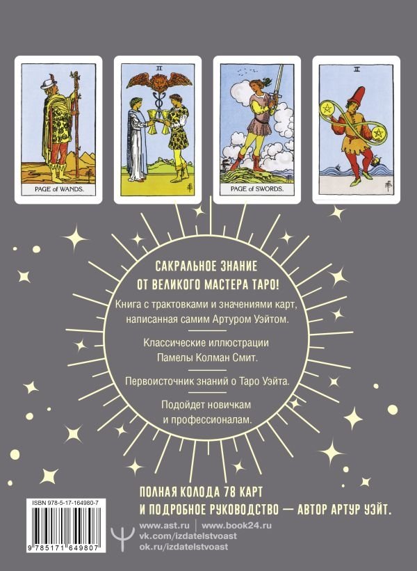 Перед вами — первоисточник! Первая книга о Таро от Артура Уэйта! Автор самой популярной колоды для гадания раскрывает главные идеи, заложенные им в карты. В подарочный комплект вошли: полная колода из 78 классических карт Памелы Колман Смит и книга, которая является точным переводом книги Уэйта без сокращений и искажений. Эта книга содержит единственное точное описание карт колоды, ведь оно сделано самим их создателем. Вы сможете лучше понять символику карт и по-другому взгляните на колоду, даже если давно работаете с ней. Колода подойдёт как начинающим, так и профессиональным тарологам. Понятый язык руководства доступно объяснит, как сделать даже самые сложные расклады. Колода также издается в формате малой коробки под названием "Подлинное Таро Уэйта. Руководство автора и 78 классических карт".