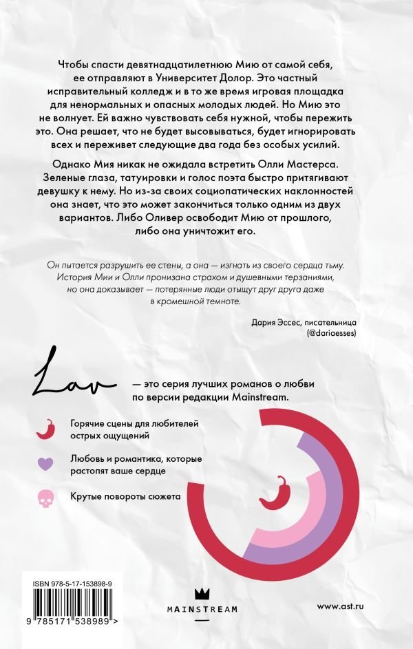 Чтобы спасти девятнадцатилетнюю Мию от самой себя, ее отправляют в Университет Долор. Это частный исправительный колледж и в то же время игровая площадка для ненормальных и опасных молодых людей. Но Мию это не волнует. Ей важно чувствовать себя нужной, чтобы пережить это. Она решает, что не будет высовываться, будет игнорировать всех и переживет следующие два года без особых усилий. Однако Мия никак не ожидала встретить Олли Мастерса. Зеленые глаза, татуировки и голос поэта быстро притягивают девушку к нему. Но из-за своих социопатических наклонностей она знает, что это может закончиться только одним из двух вариантов. Либо Оливер освободит Мию от прошлого, либо она уничтожит его.