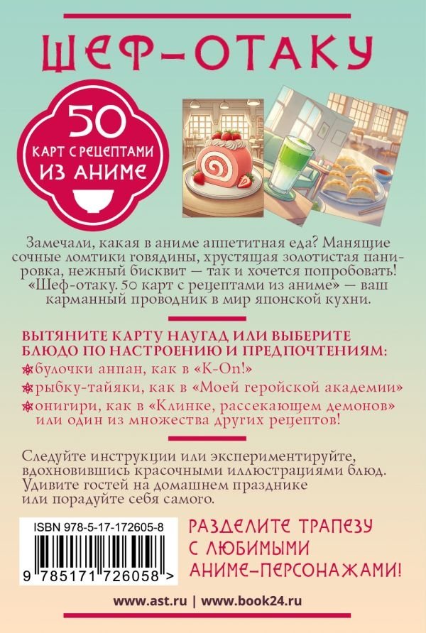 Замечали, какая в аниме аппетитная еда? Манящие сочные ломтики говядины, хрустящая золотистая панировка, нежный бисквит - так и хочется попробовать! "Шеф-отаку. 50 рецептов из аниме" — ваш карманный проводник в мир японской кухни. Вытяните карту наугад или выберите блюдо по настроению и предпочтениям: - булочки анпан, как в "K-On!" - рыбку-тайяки, как в "Моей геройской академии" - онигири, как в "Клинке, рассекающем демонов" или один из множества других рецептов! Следуйте инструкции или экспериментируйте, вдохновившись красочными иллюстрациями блюд. Удивите гостей на домашнем празднике или порадуйте себя самого. Разделите трапезу с любимыми аниме-персонажами!