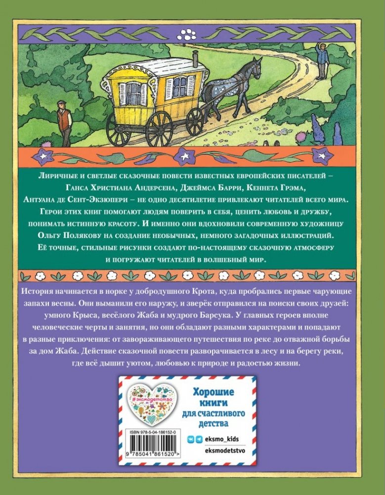 Крот, Крыс, Жаб и Барсук – четыре друга, которые живут в прекрасной сельской местности на берегу реки. У них вполне человеческие занятия: сходить в гости к соседу, отправиться в путешествие и даже купить новенький автомобиль. Несмотря на разные характеры и увлечения, друзья держатся друг друга и всегда готовы прийти на помощь. Перевод Наталии Виноградовой, в сокращении. Иллюстрации современного художника Ольги Поляковой.