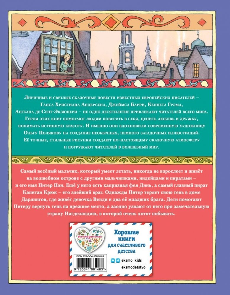 Питер Пэн – очень необычный мальчик. Он покорил сердца малышей по всему миру своими озорными приключениями и смелыми подвигами. В его мире можно познакомиться с настоящими индейцами, пиратами и феями и, что самое интересное, можно никогда не взрослеть. Перевод Наталии Виноградовой, в сокращении. Иллюстрации современного художника Ольги Поляковой.