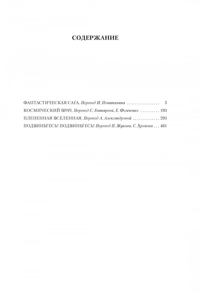 В настоящий сборник вошли лучшие «сольные» романы автора, отражающие самые разные грани таланта этого замечательного фантаста. Тема путешествий во времени представлена знаменитой «Фантастической сагой» — романом о том, как ушлые киношники Голливуда вытаскивают из прошлого викинга и заставляют его открыть Америку. В «Космическом враче» и «Плененной Вселенной» главный герой, наряду с действующими в романах персонажами, — Космос. В фантастическом детективе «Подвиньтесь! Подвиньтесь!» писатель окунает нас в постапокалиптическое будущее Америки.