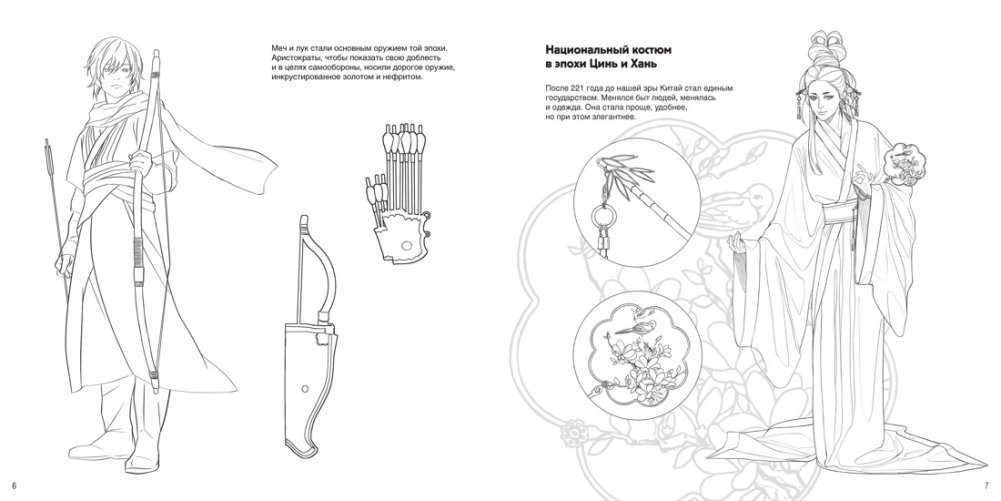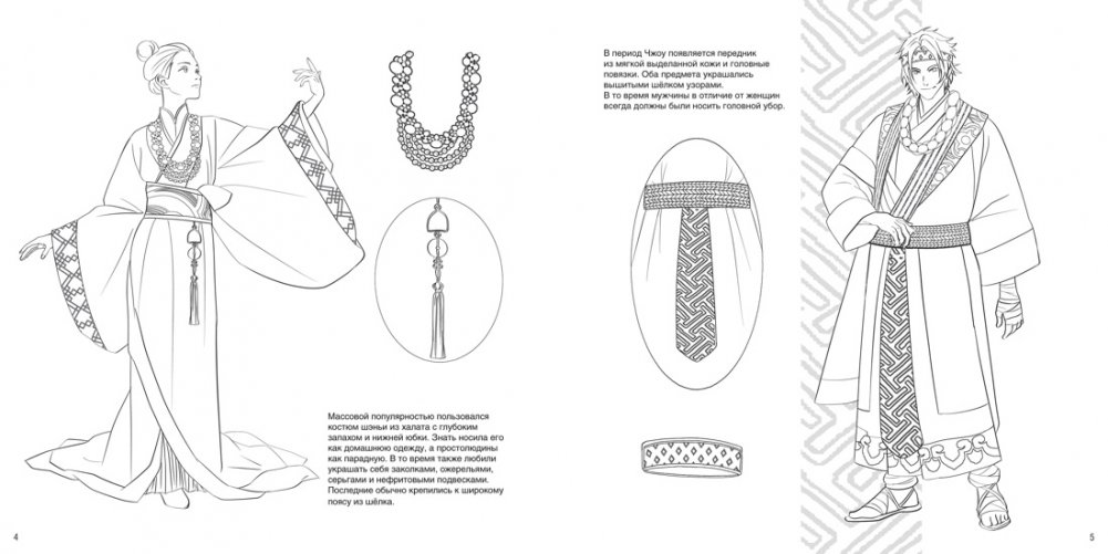 Книга для раскрашивания «Китайский национальный костюм» – это коллекция из 46 иллюстраций от 4-х современных художниц: Plus+, ShumsterArt, BRIT/0.5, Apple Grace, каждая из которых обладает своей уникальной графической манерой. Иллюстрации сопровождаются краткой исторической справкой о том, как на протяжении эпох менялась одежда жителей Поднебесной.