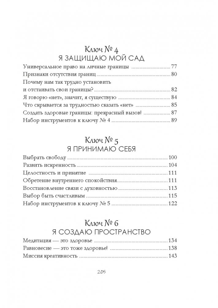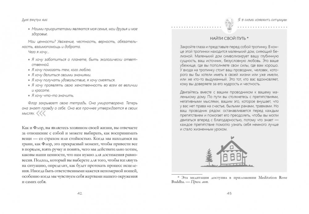 Катя и Максим Морен предлагают остановиться и с помощью их концепции «дома внутри нас» понять, что с нами происходит. Восемь ключей научат: принимать свои особенности, как Доминик принял СДВГ; уделять себе время для восстановления, как Эммануэль, что минимум 24 часа в месяц посвящает исключительно себе; не брать чужую ответственность, как Шанталь, решившая больше не тащить на себе лишний груз.
